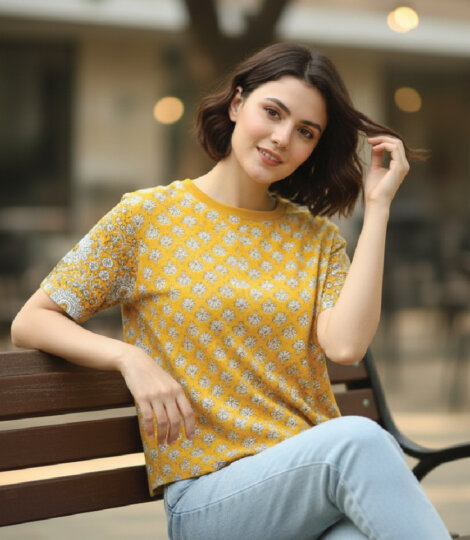 Mustard Yellow Cotton T-shirt Kurti Top for Women