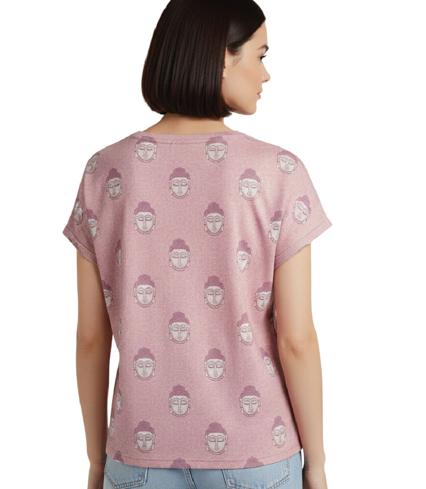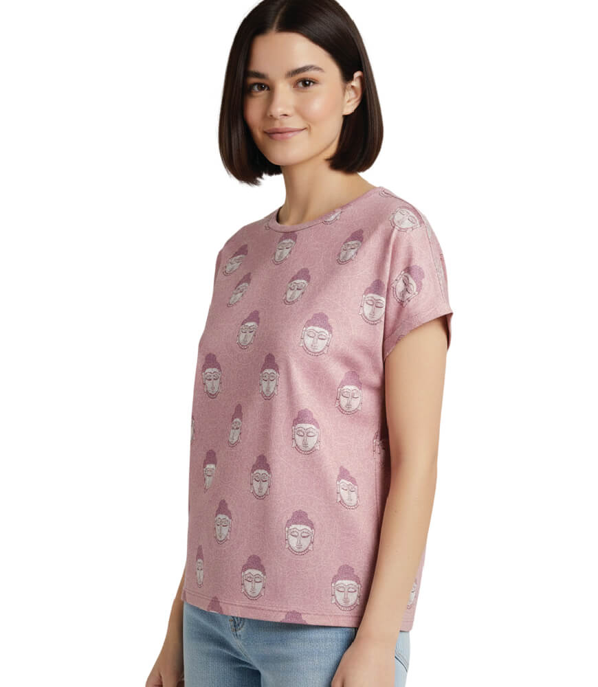 • Stunning Design: This t-shirt showcases several darker pink Buddha figures against a backdrop of lighter pink, adorned with intricate Kalamkari patterns, creating a mesmerizing visual display.