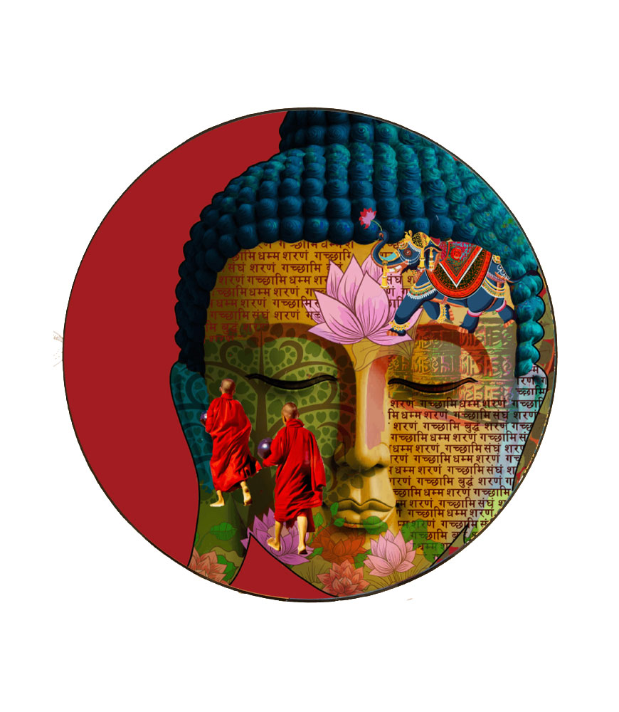 Immerse yourself in a meditative journey with this unique wall plate, a stunning blend of spirituality and artistry. At its heart is a serene depiction of Buddha’s face, exuding tranquility and wisdom, surrounded by vibrant elements that narrate a story of peace and cultural harmony.