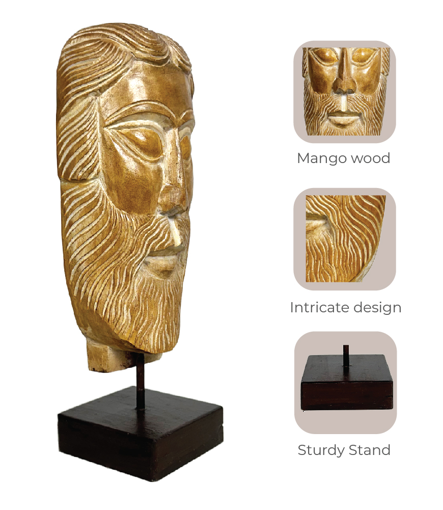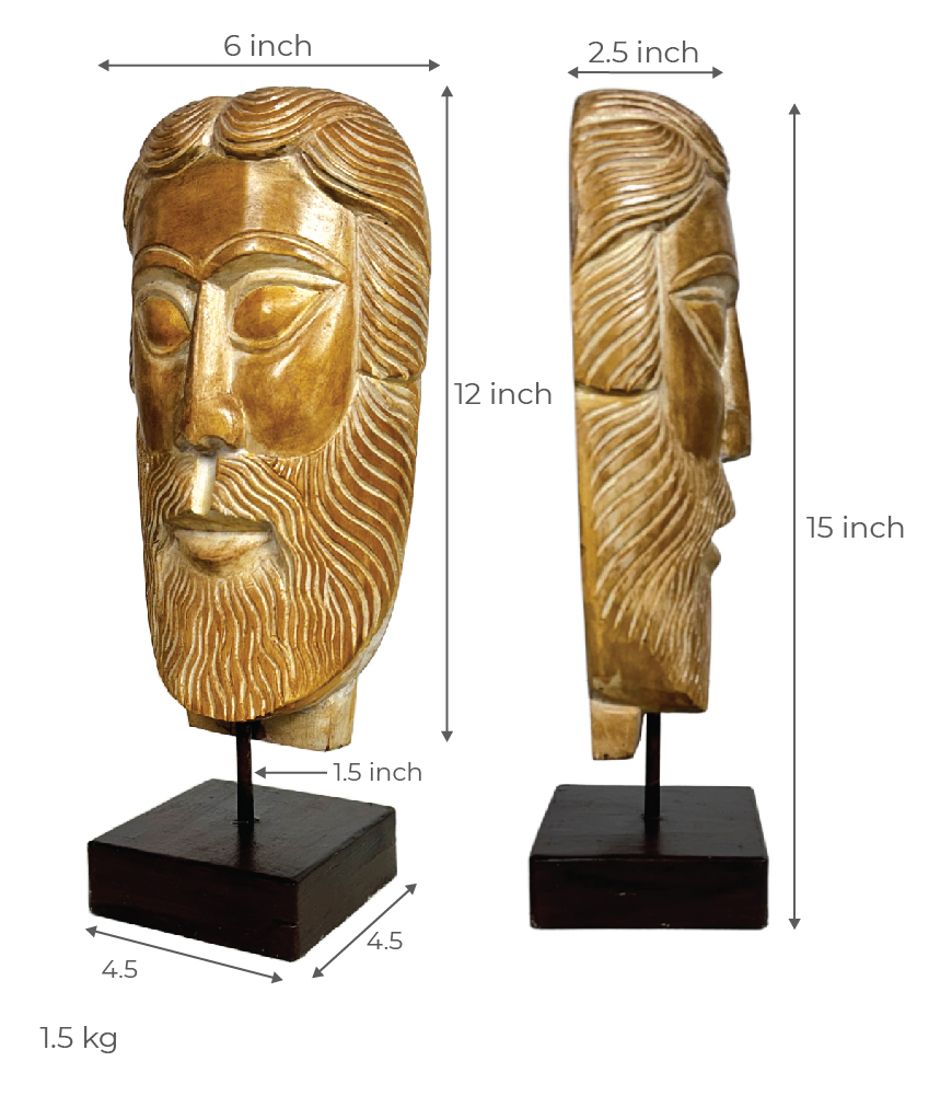 The beautifully detailed wood carving head of Jesus figurine from India will add charm to your space. Also known as Messiah wood head sculpture, it is perfect for table top décor or for worship. This exclusive piece has been made for Maatir and this head statue is a traditional wood hand carved sculpture. The gold glossy finish on the wooden handmade natural statue makes it an elegant all natural India Jesus idol figurine. The stand elevates the head sculpture and makes it easy to create a classy table top decor. This statue perfect mindful handmade traditional gift option for home or office.