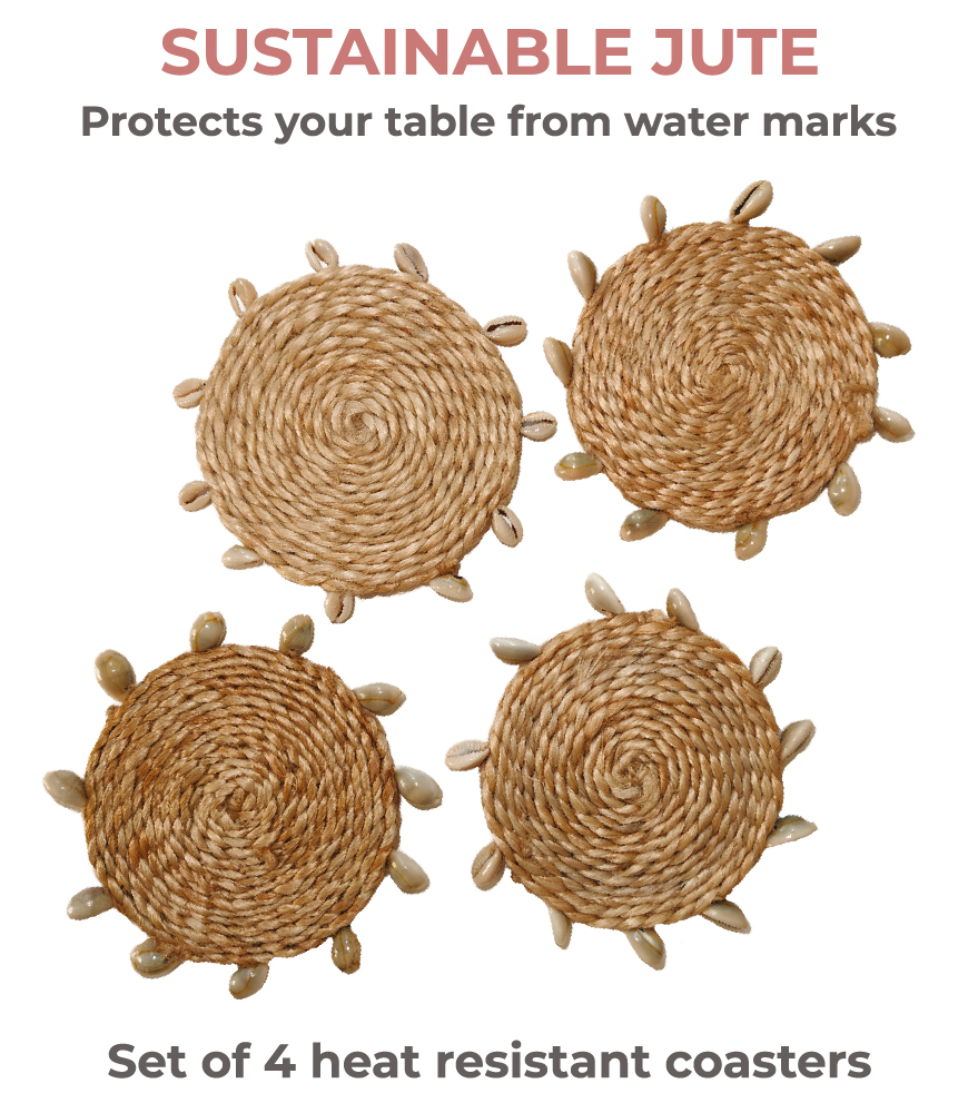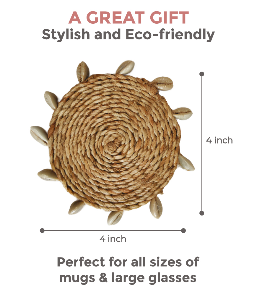 Each coaster measures 4 inches, making it the perfect fit for all types of drinkware—from teacups and coffee mugs to water glasses, cocktails, bottles, and more. The natural jute fibers help absorb moisture and protect your furniture from beverage rings, heat, and scratches.
