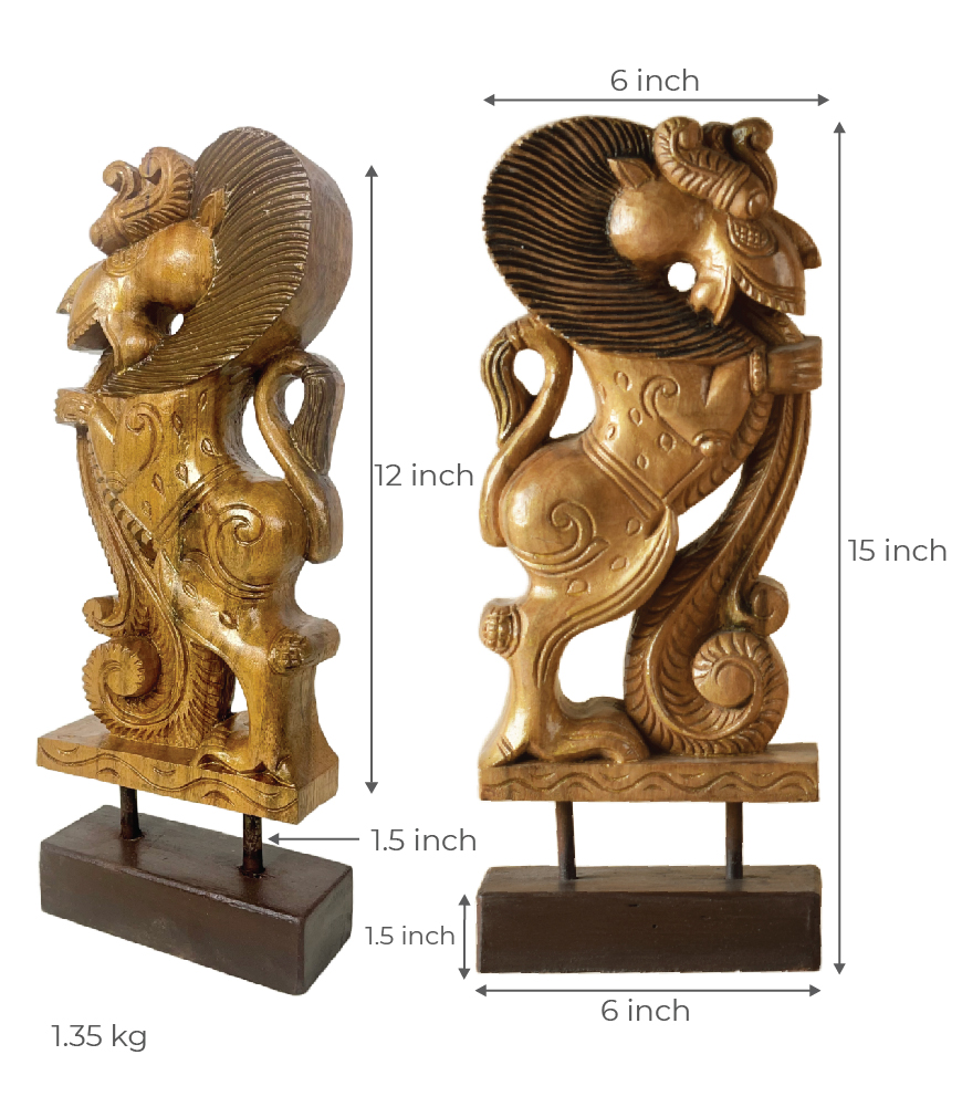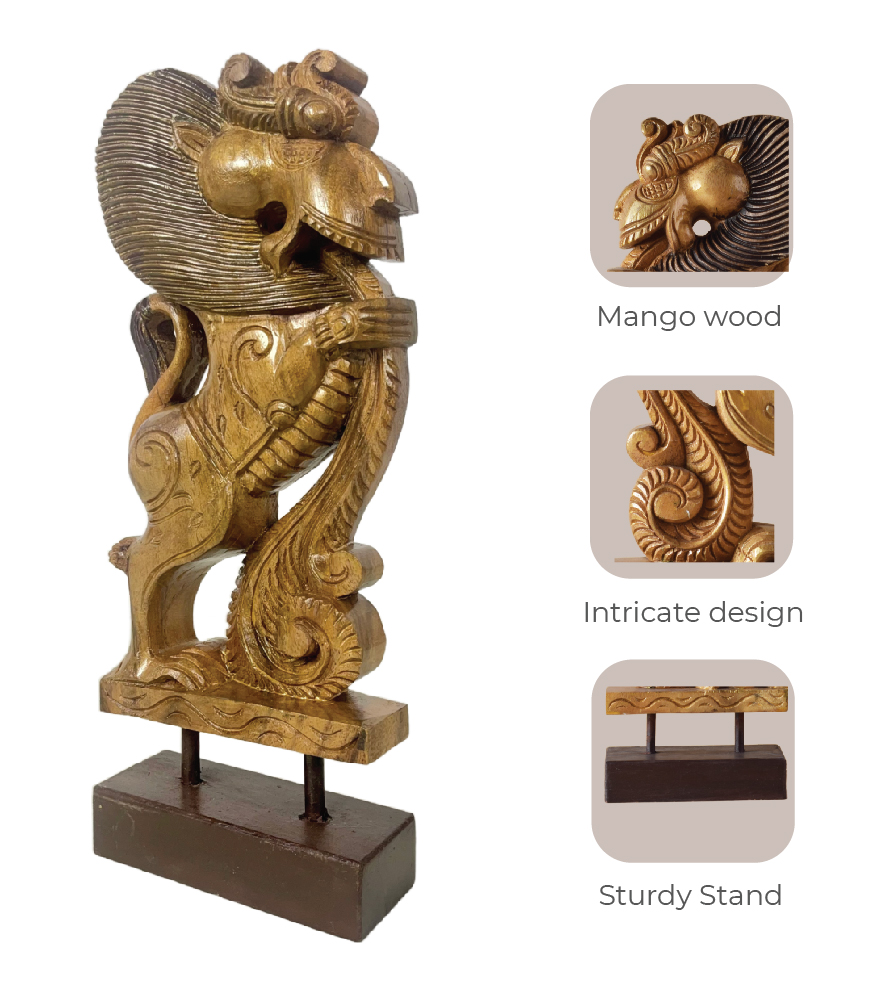 Handcrafted Wooden Yali Lion Figurine – Traditional South Indian Mythical Beast | Hand- Carved Wooden Sculpture with Metallic Tint Polish by Maatir