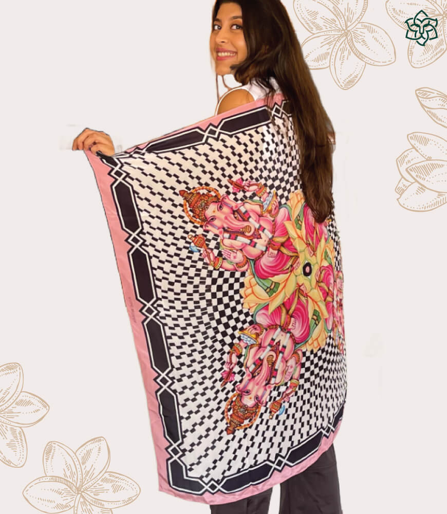 This chic and luxurious pure silk multi-colored printed scarf is inspired by Lord Ganesha. The fabric is natural, soft and lightweight. Instantly adding elegance to any outfit, this airy skin friendly designer Vegan Silk scarf is made to add drama and beauty to any neutral outfit. Pair it with black, white or pink shirts to elevate your look. Pops of colors such as greens and yellows allow you to confidently pair this scarf with many looks. Highlight your style with this elegant silk scarf from Maatir.