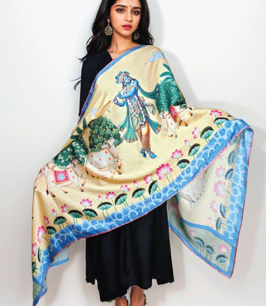 This original Maatir design depicts Krishna with cows and lotus motifs in both Miniature and Pichwai styles. The soft, flowing fabric drapes beautifully, enhancing your silhouette with grace. This elegant yellow and blue dupatta stole serves as a statement piece that adds a distinctive touch to your outfit, making you stand out in any crowd. Maatir elegant traditional design long stoles enhance the beauty of any solid colour outfit, making them a must-have for anyone looking to add a touch of timeless elegance to their wardrobe.