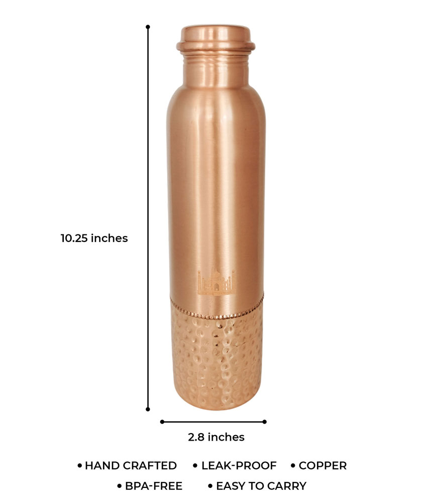 Crafted from 100% pure copper, this bottle is more than just a container – it’s a lifestyle choice. Inspired by the timeless beauty of the Taj Mahal, the etched design and hammered texture make this bottle a work of art while offering the wellness benefits of copper.