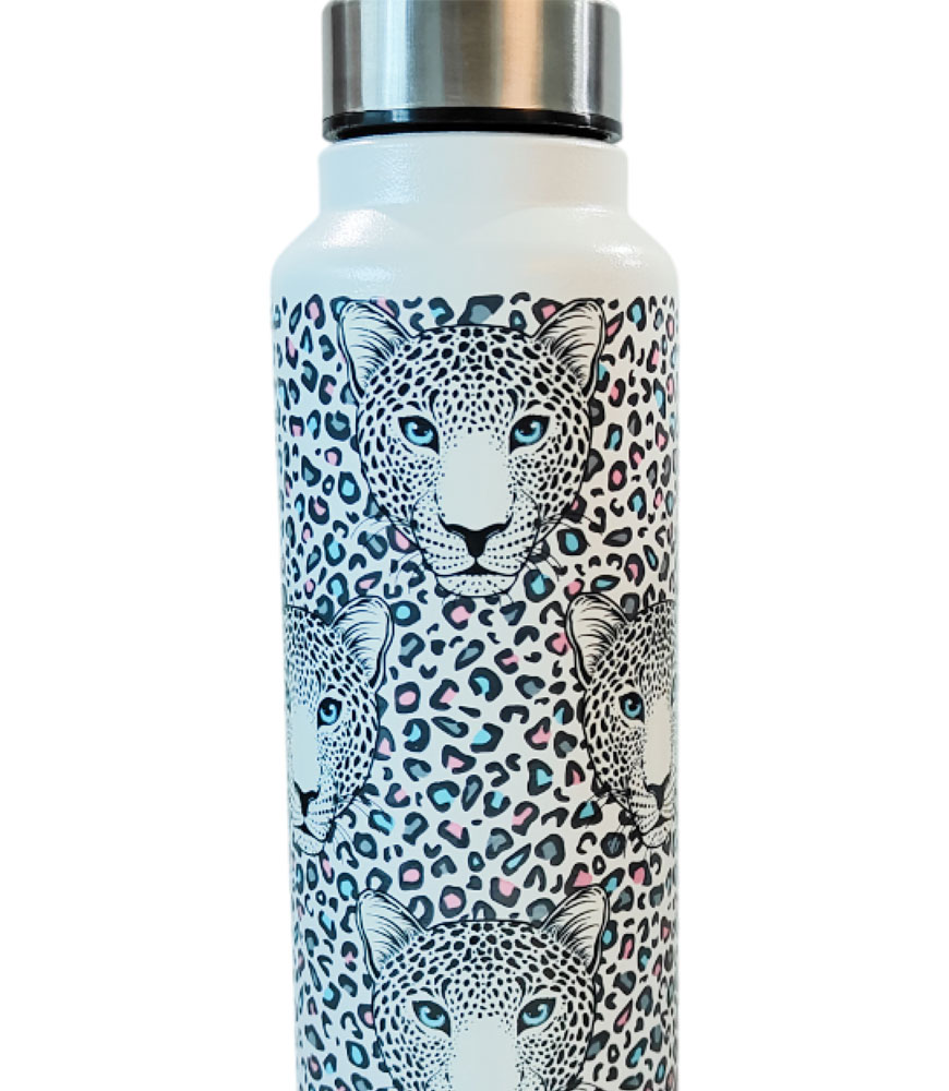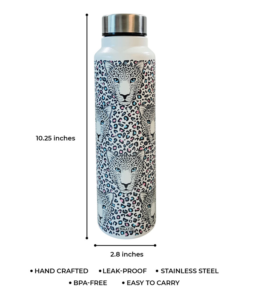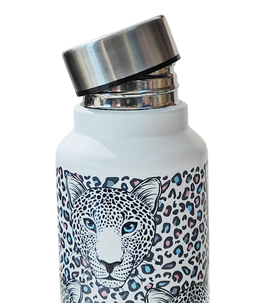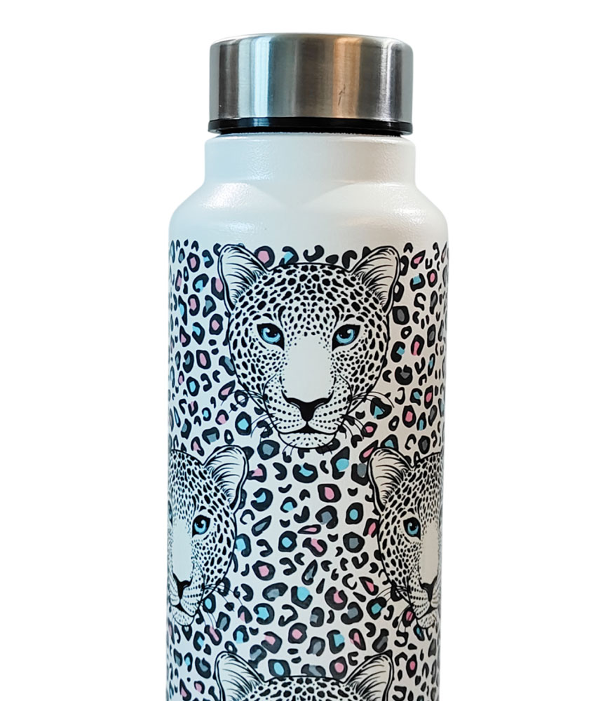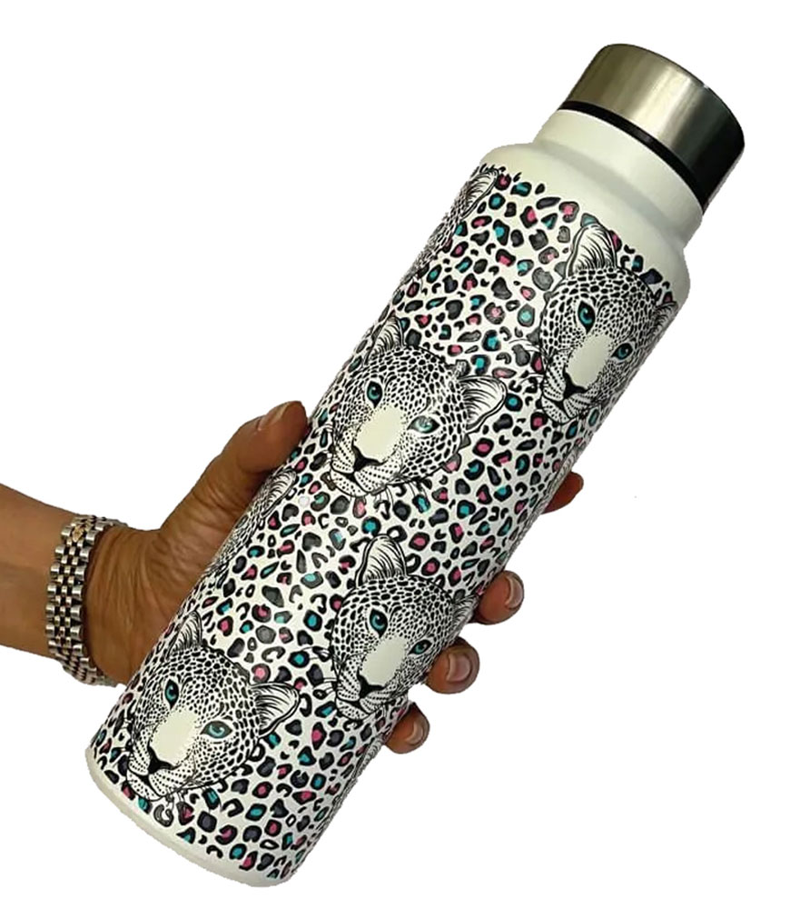 This elegant and premium leopard art steel water bottle references the vibrant and majestic big cat of India. Made with the highest quality of steel to provide safe and clean hydration, this stylish bottle will quench your thirst and keep you in good health for years. The lightweight bottle fits almost one liter of water and is the ideal daily companion from dawn to dusk.