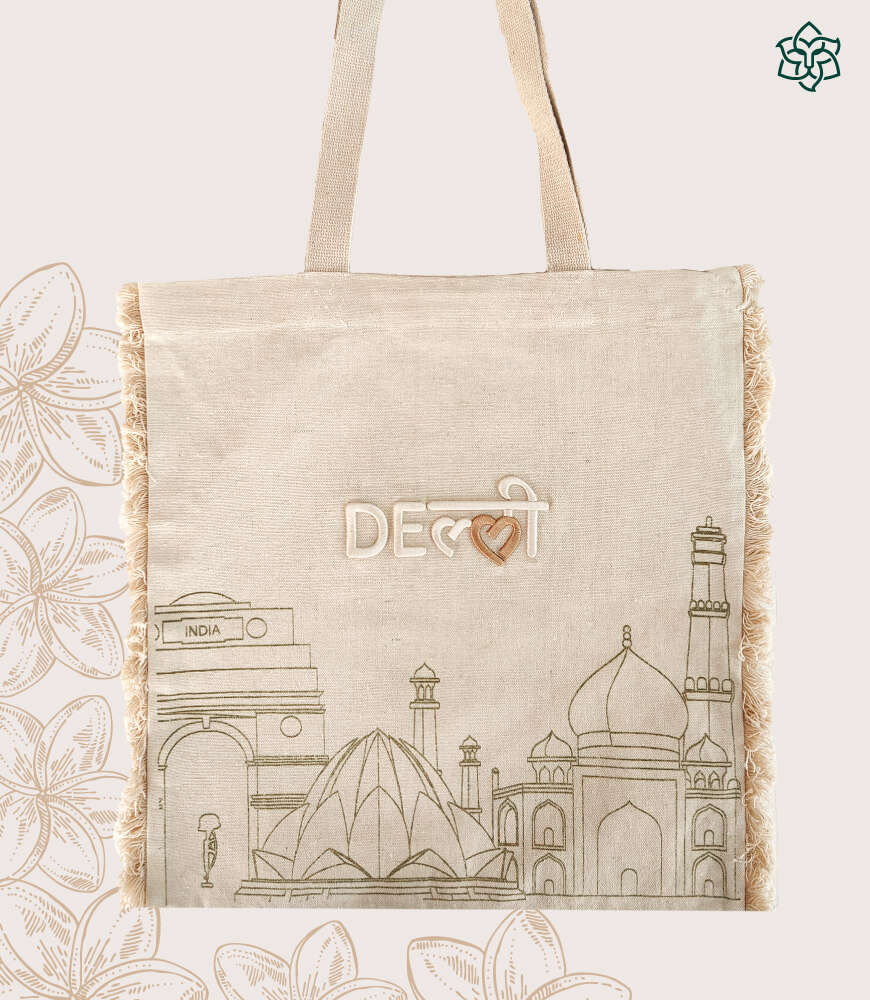 This cream-colored tote features a delicately printed gold background of Delhi’s most iconic monuments, symbolizing the city’s timeless charm. At the center, a bold 3D embroidered “Delhi” logo adds texture, depth, and a premium finish, making it an eye-catching accessory for everyday use or gifting.