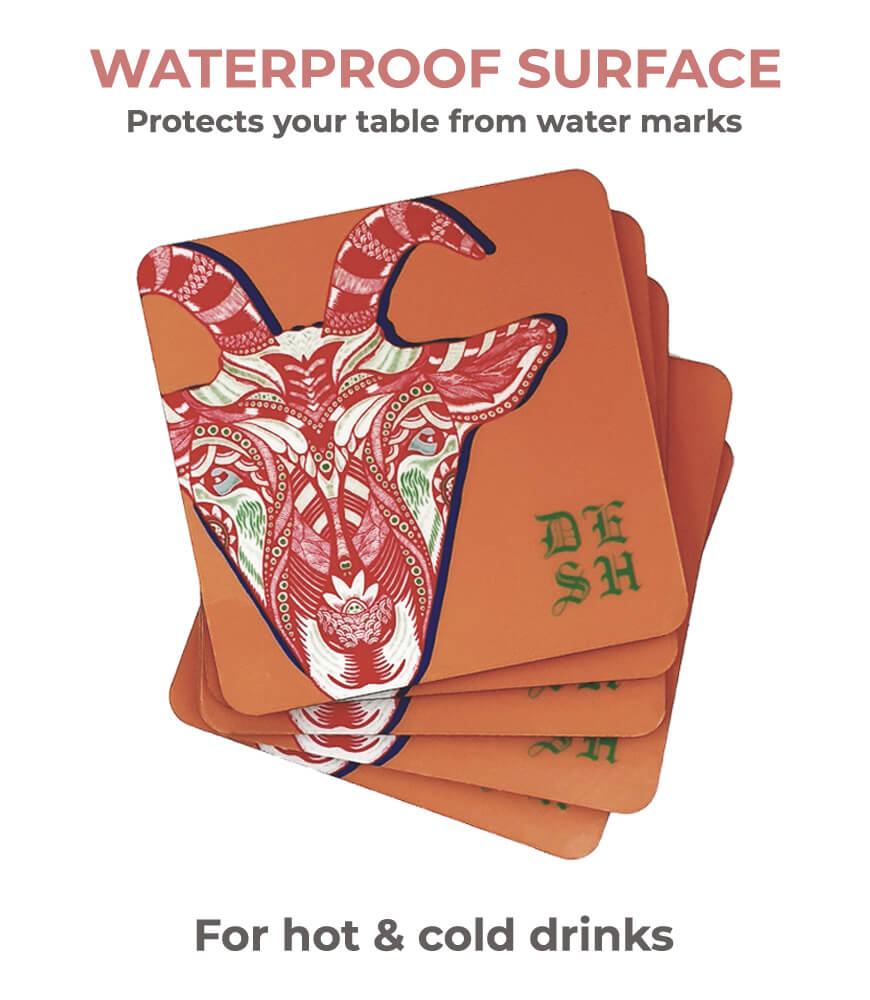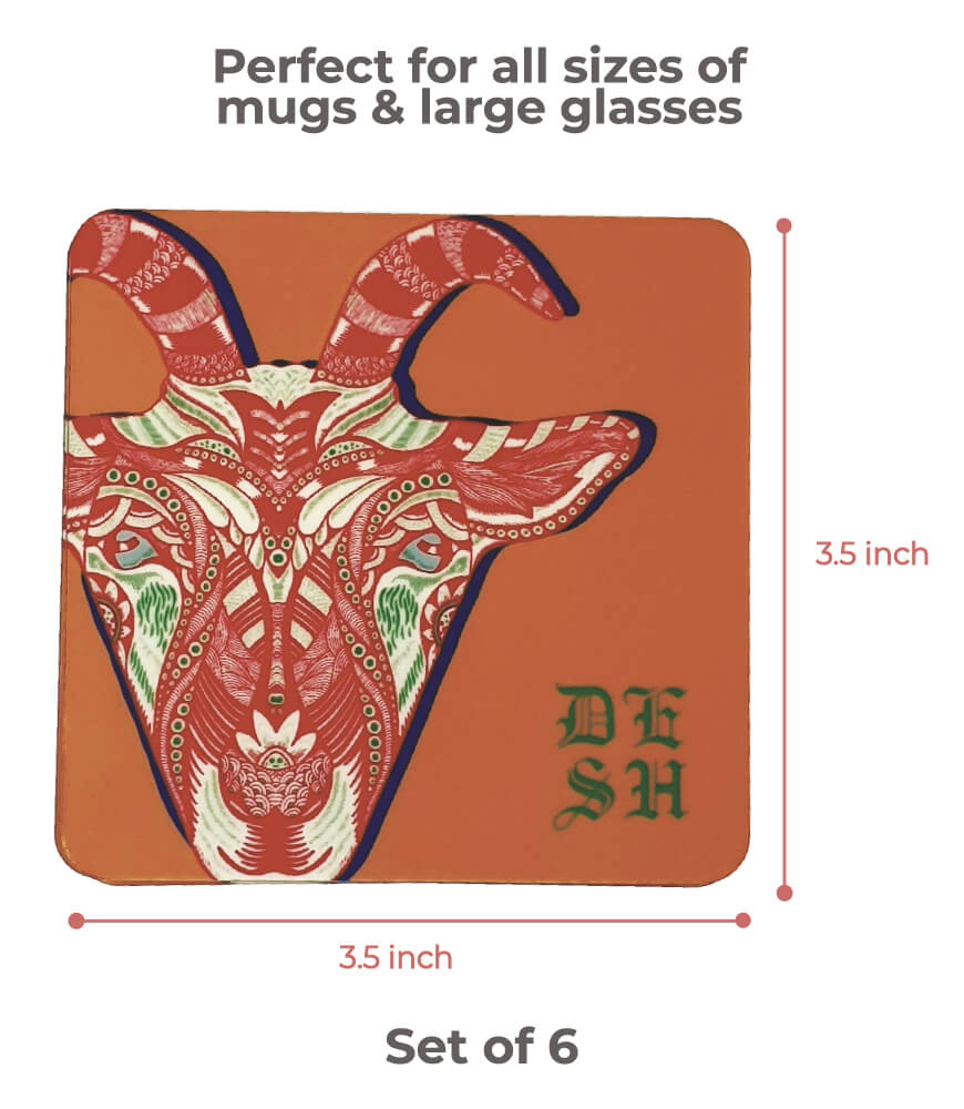 Bring color, culture, and creativity to your table with Maatir’s Set of 6 Wooden Printed Coasters, featuring a vibrant and original Indian tribal goat pop art design on a bold orange background. These coasters combine modern artistic expression with ethnic Indian inspiration, creating a striking accessory for your home or workspace.