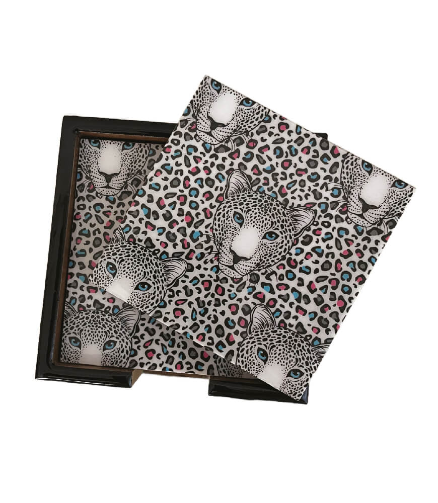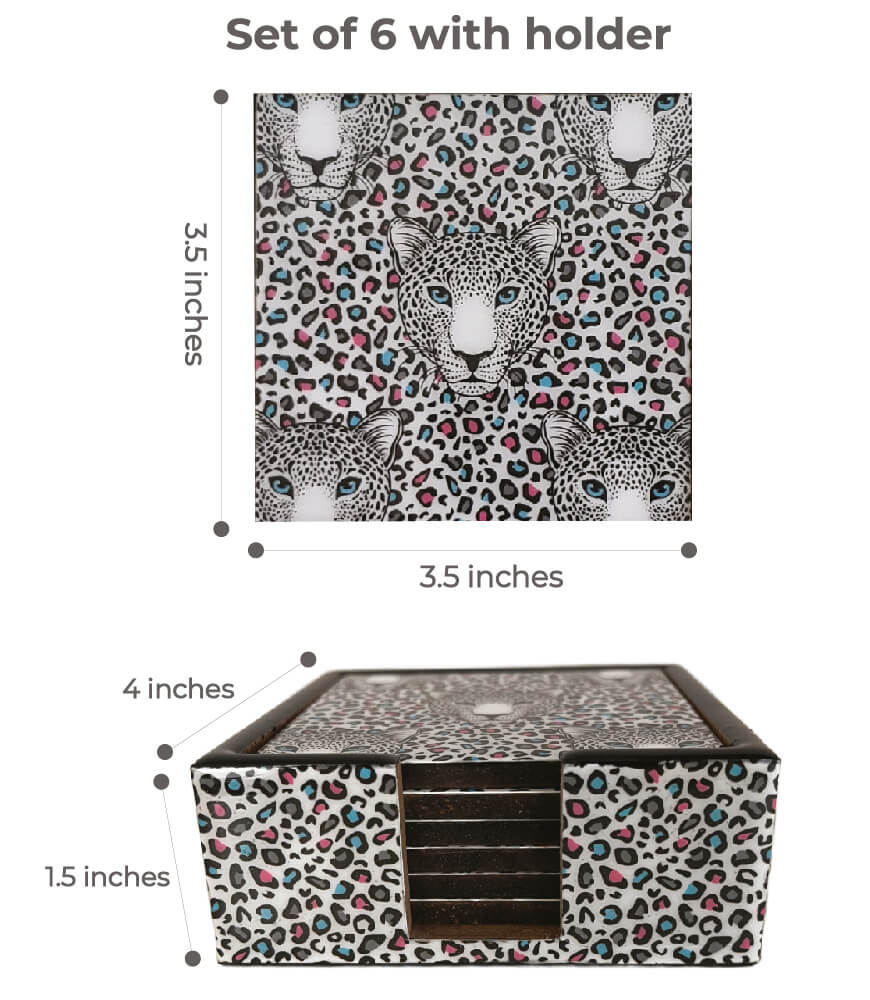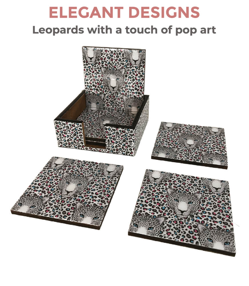 Upgrade your table décor with the Maatir Set of 6 Wooden Printed Coasters with Matching Wooden Case, featuring an exclusive Indian Leopard Pop Art design in stylish black and pastel tones on a clean white background. This bold yet elegant pattern is part of Maatir’s signature art series, blending Indian wildlife inspiration with contemporary pop art aesthetics.