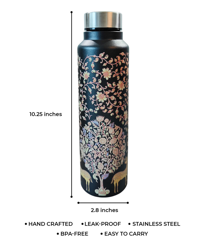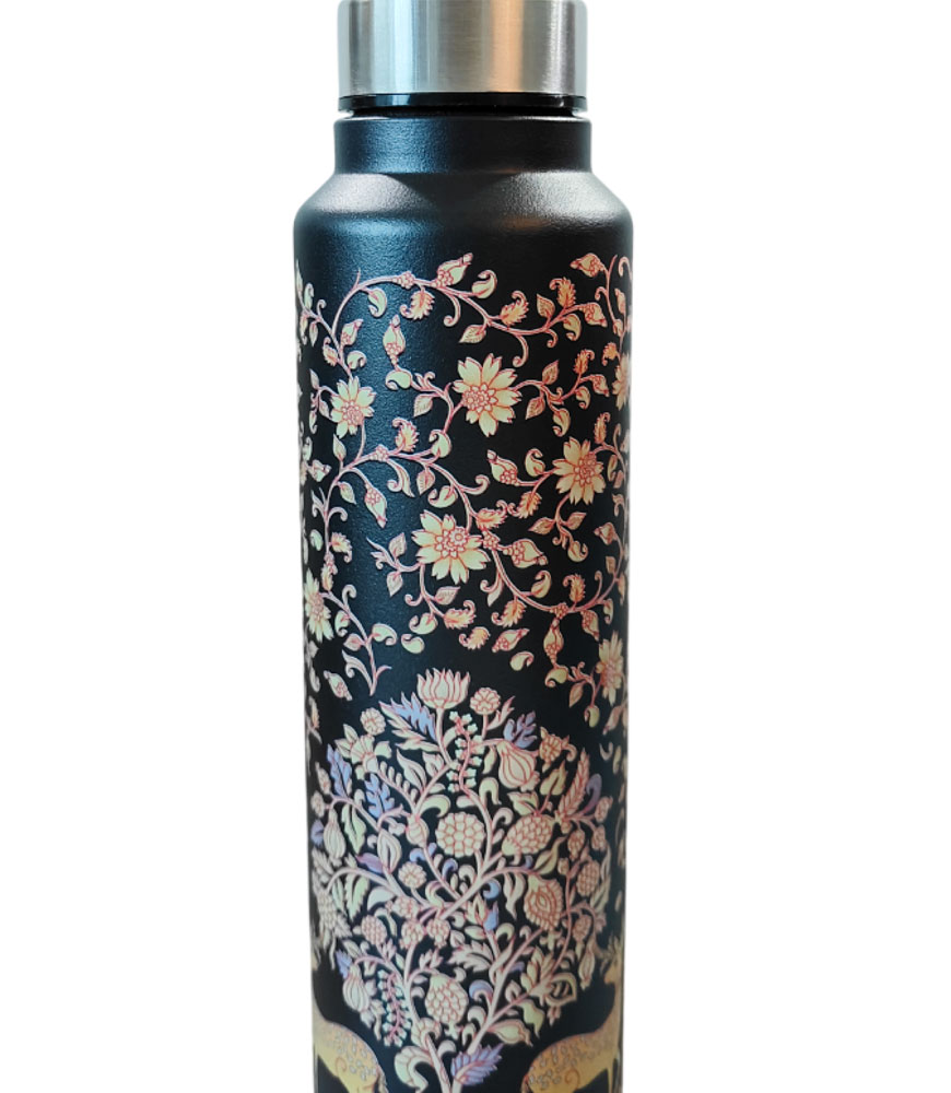 This bottle is more than just a utility—it is a work of art inspired by India’s Kalamkari tradition, where every detail tells a story of nature, harmony, and craftsmanship. With its sleek black base adorned with golden Kalamkari deer and forest motifs, the design stands out as both modern and timeless.