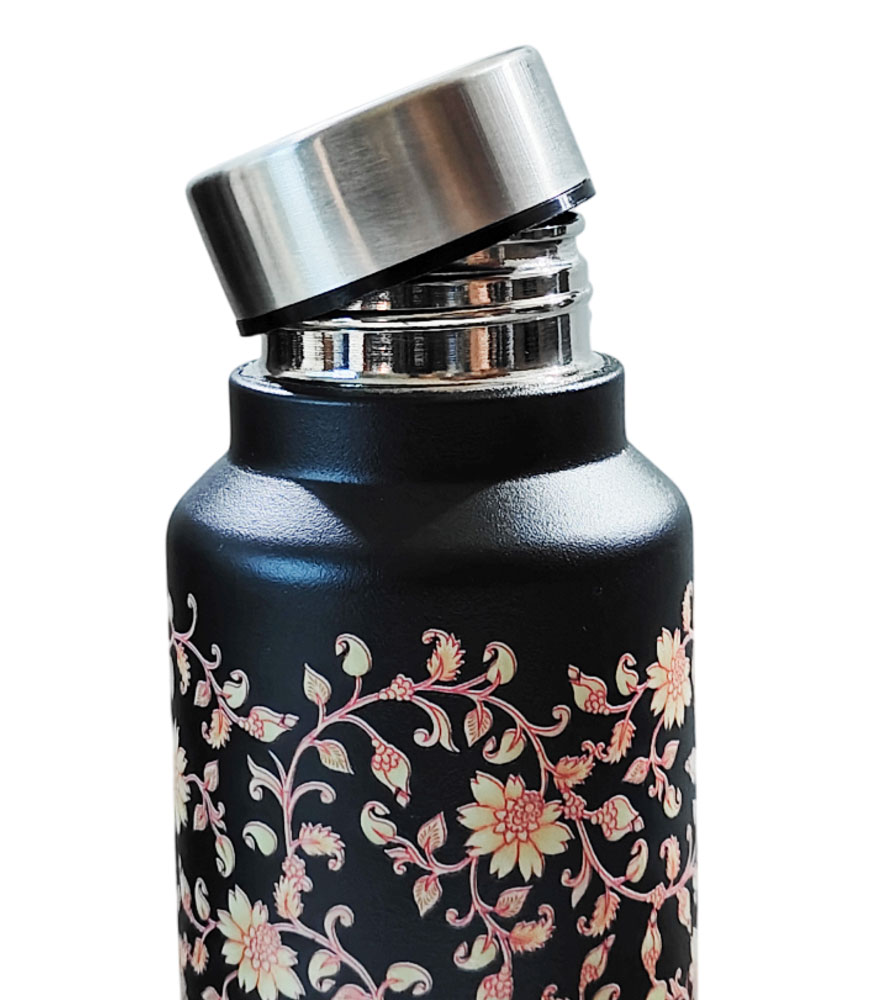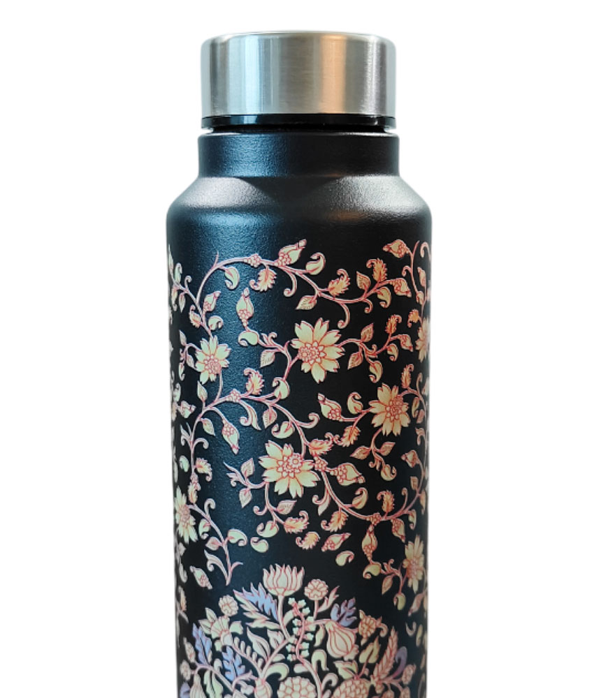 Keywords for Amazon SEO: designer printed water bottle, elegant stainless steel bottle, kalamkari art water bottle, Indian art printed bottle, stylish reusable bottle, eco-friendly stainless steel gift bottle, black and gold water bottle.
