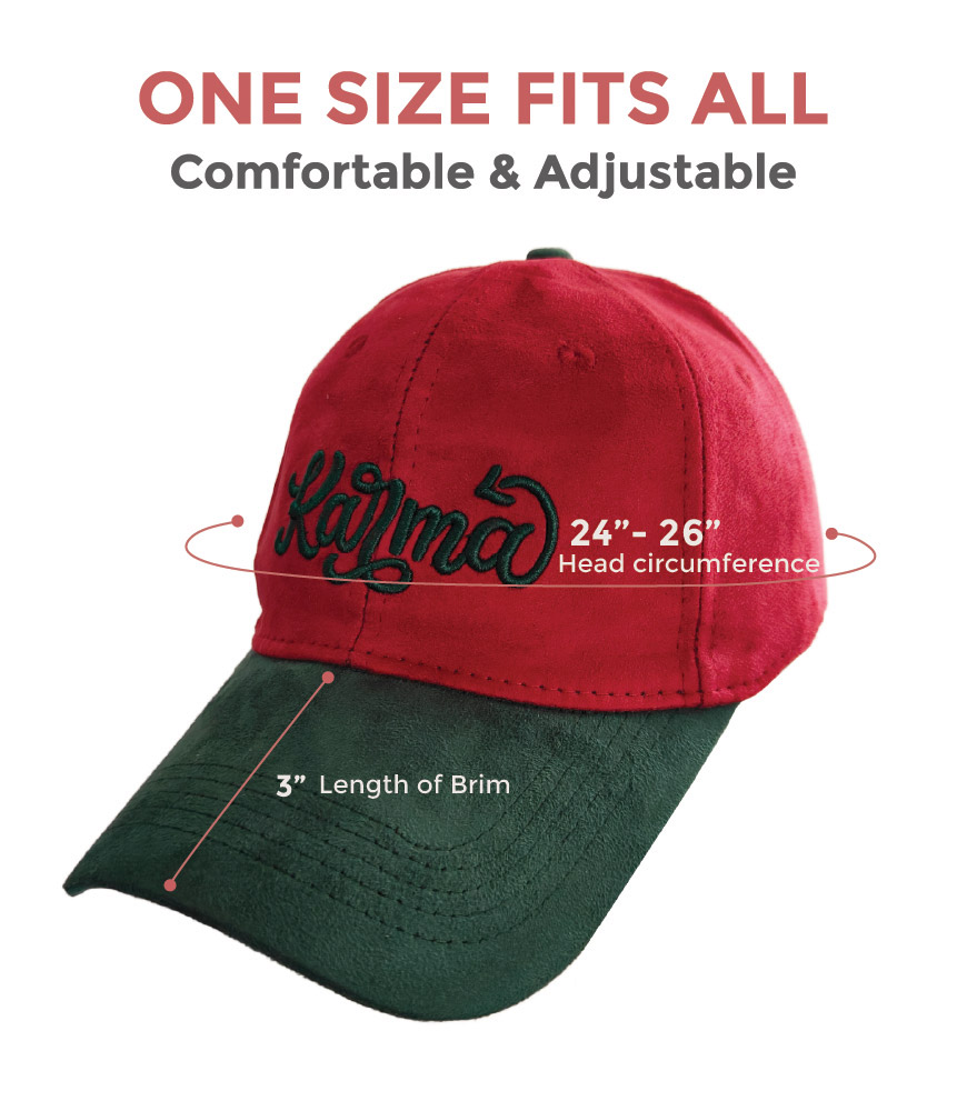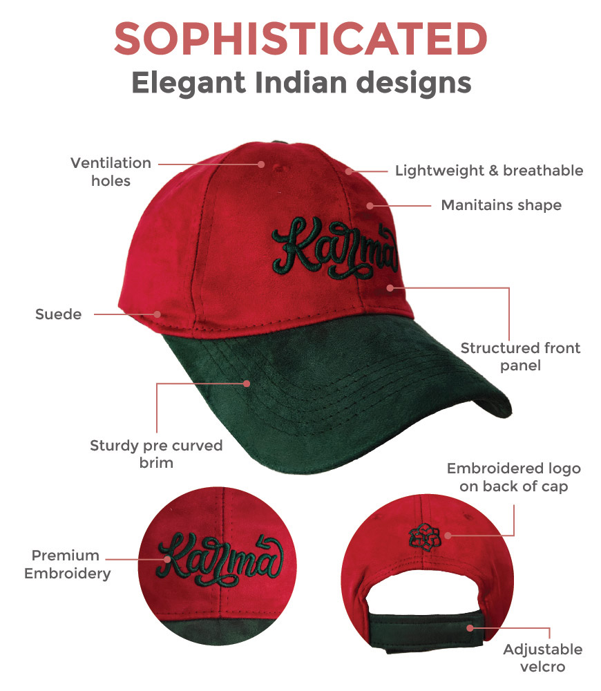 Upgrade your everyday style with the Maroon & Deep Green Suede Premium Baseball Cap with Karma Embroidery – a perfect balance of elegance, comfort, and meaningful design.