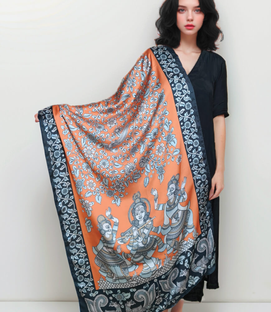 This original Maatir design depicts Peacocks with Kalamkari floral motifs and designs that are deeply rooted in Indian culture. The soft, flowing fabric drapes beautifully, enhancing your silhouette with grace. This elegant orange dupatta stole serves as a statement piece that adds a distinctive touch to your outfit, making you stand out in any crowd.