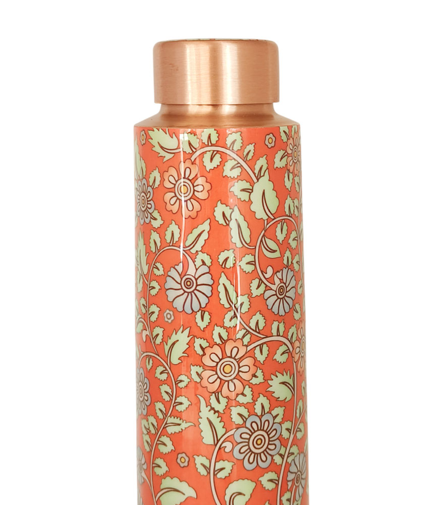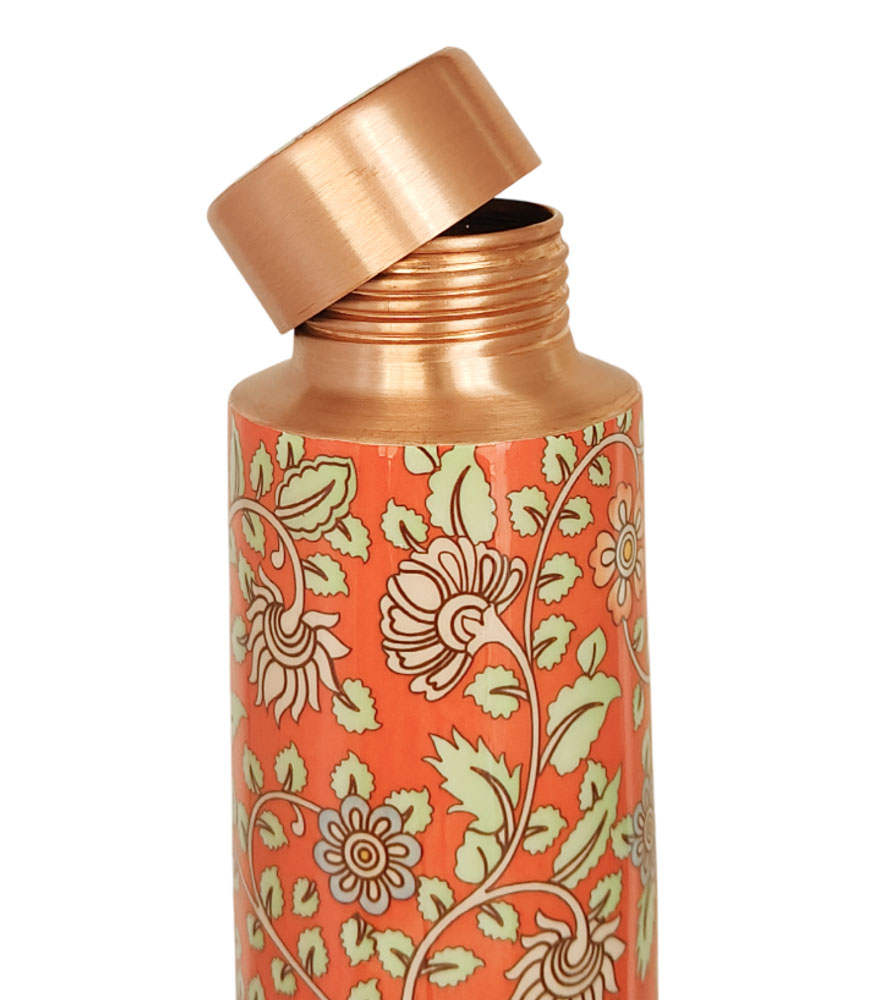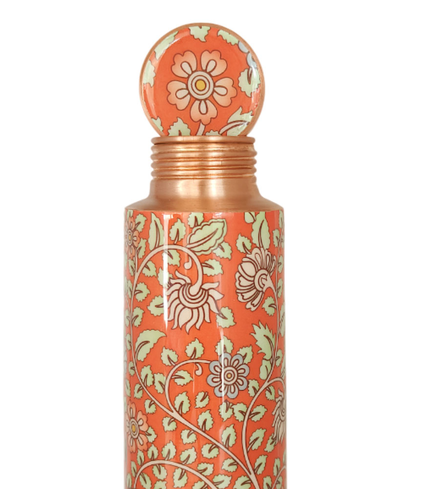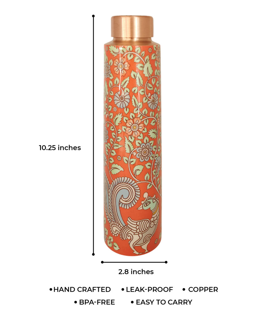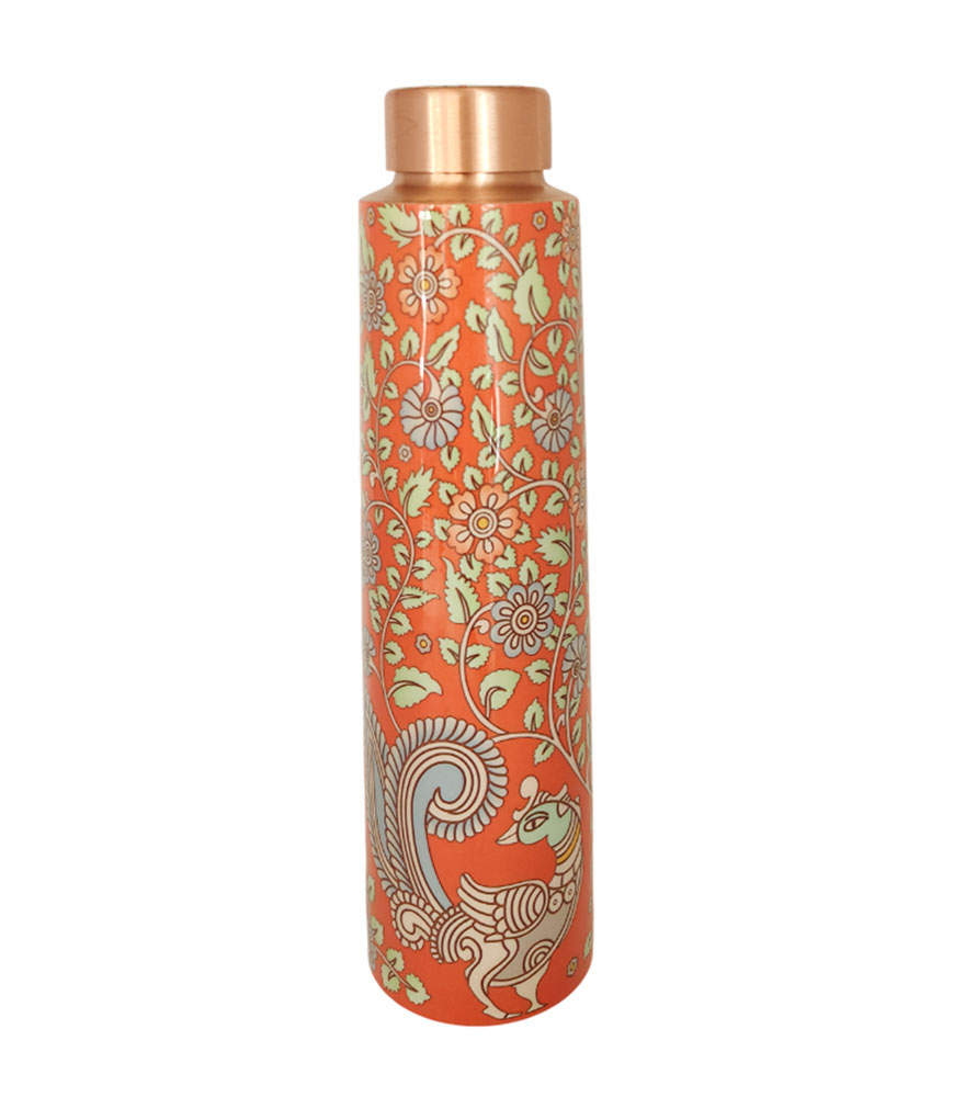 Orange Traditional Kalamkari Art Pure Copper Reusable Large Water Bottle