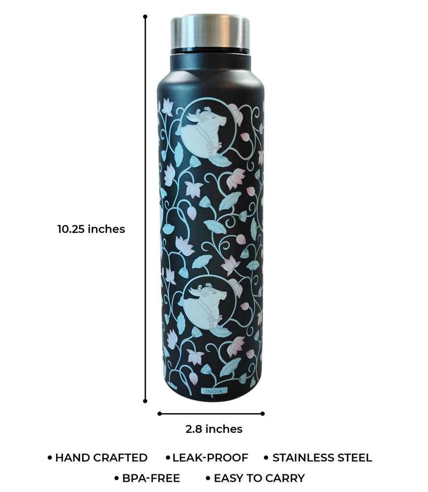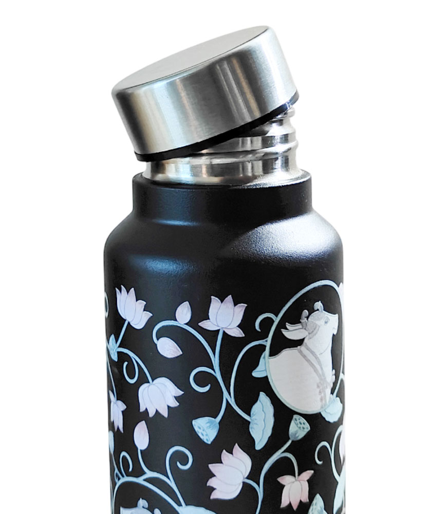 Carry a piece of tradition with you every day with this Pichwai Art Stainless Steel Water Bottle, designed with intricate lotus and cow motifs inspired by the sacred Pichwai paintings of Rajasthan. Set against a sleek black base, this bottle is more than just functional – it’s an elegant cultural statement.