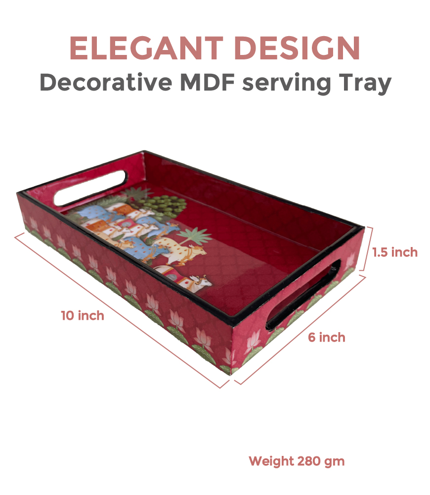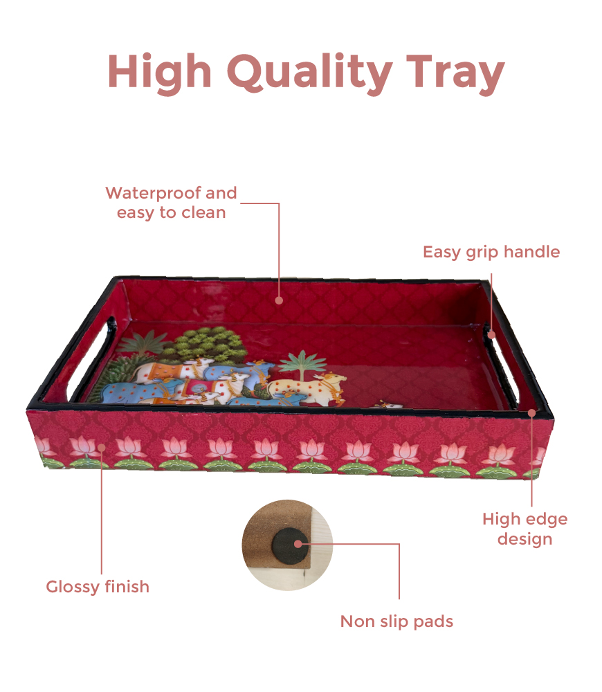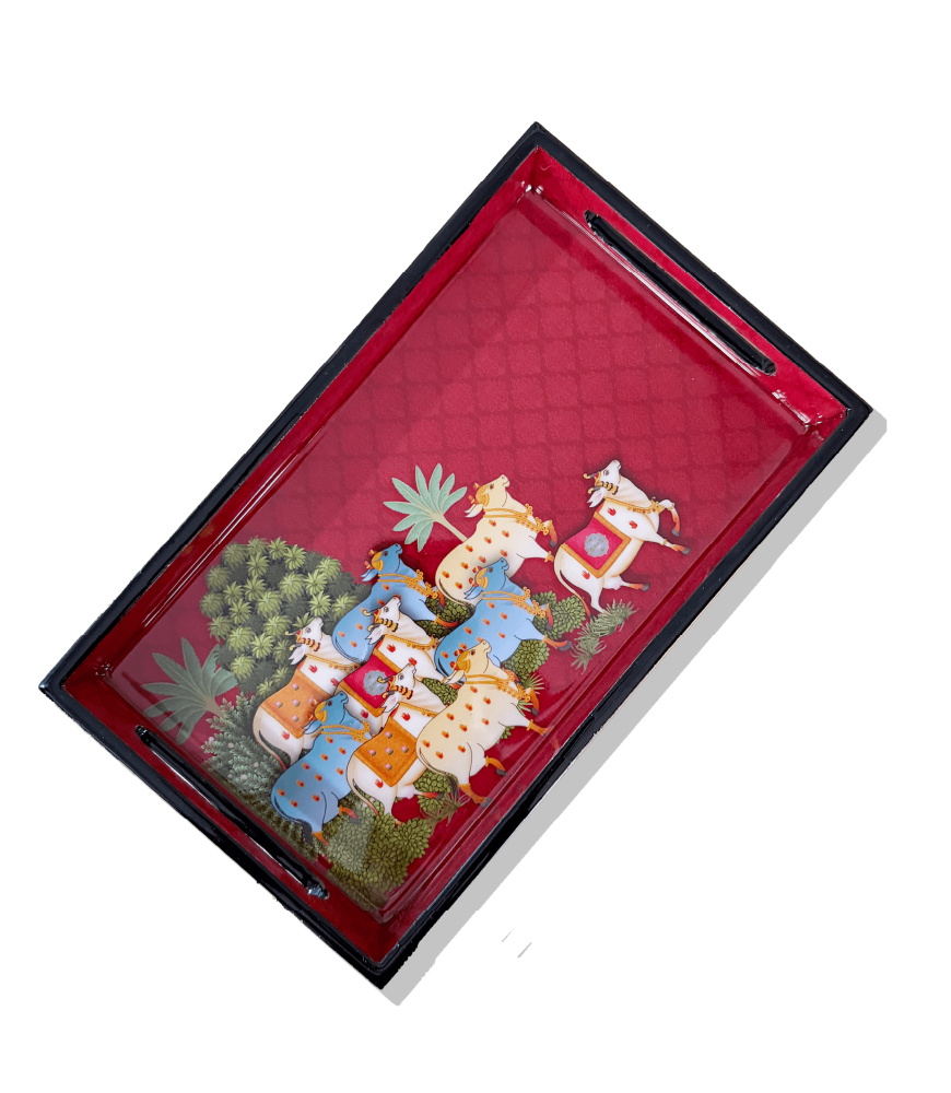 Immerse yourself in the timeless elegance of Rajasthani art with this Pichwai-Inspired Tray, a tribute to the centuries-old painting tradition of Nathdwara. At its center, serene cow figures—a symbol of divinity and abundance—gracefully take their place, surrounded by lush trees, blooming flowers, and intricate patterns that evoke harmony and tranquility.