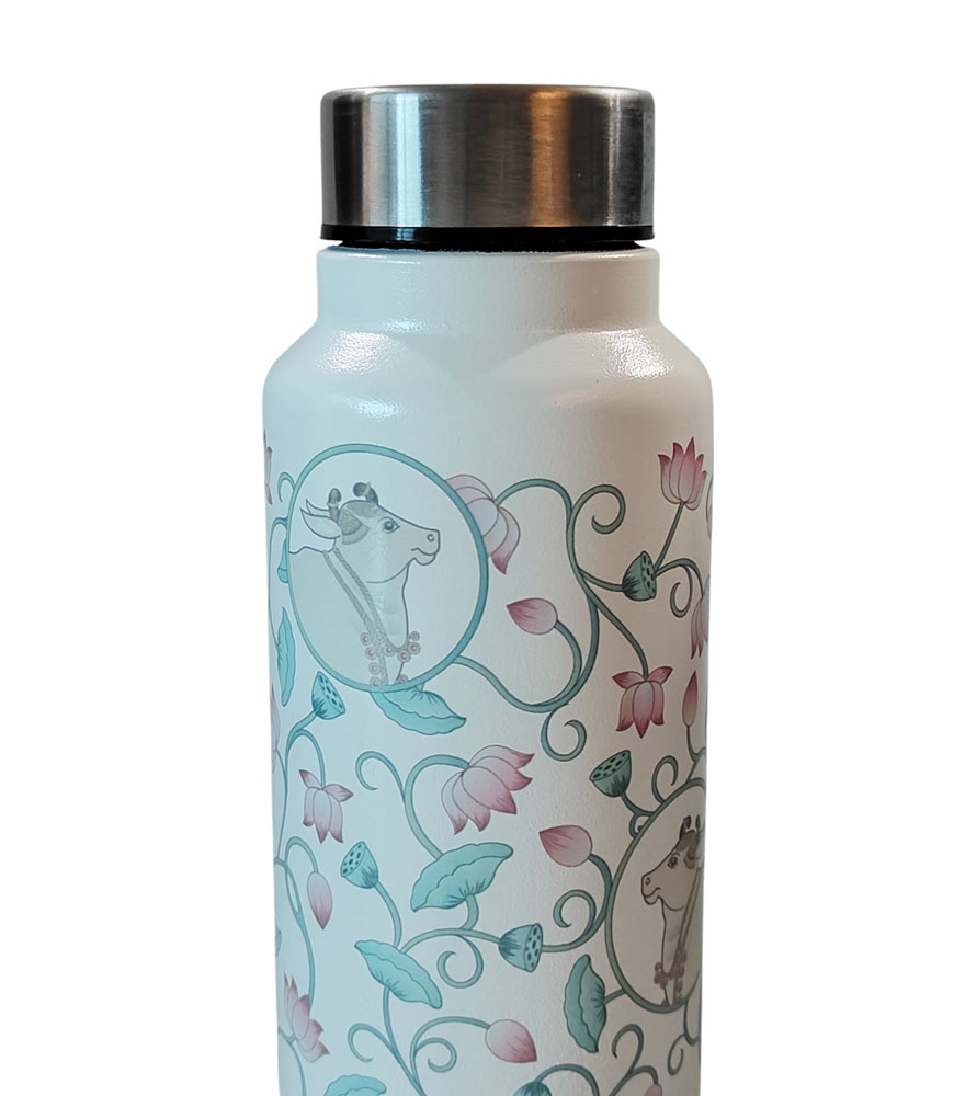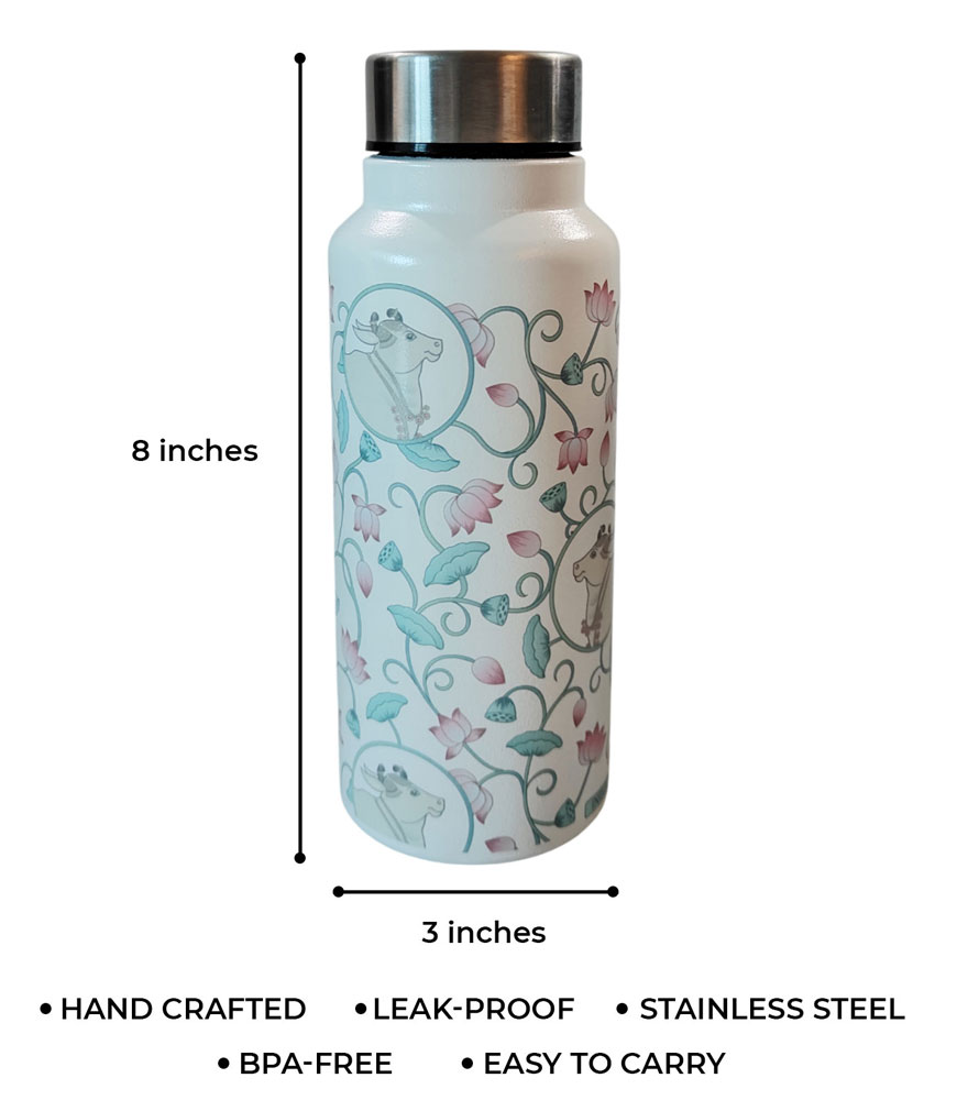 Bring elegance and tradition to your everyday hydration with the Pichwai Art Stainless Steel Water Bottle in white, designed with exquisite lotus and cow motifs inspired by Rajasthan’s heritage Pichwai paintings.