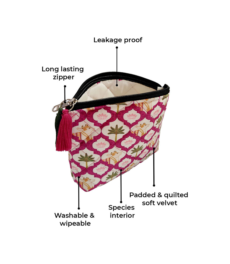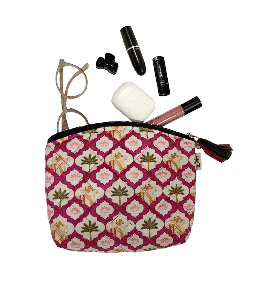 This pretty Pichwai cow and floral print has been created to bring color and charm to your travel toiletry and make-up routine. The smaller pouch is perfectly sized for your sunglasses and easily holds up to two pairs. This multipurpose waterproof pouch set is lightweight, hardy, waterproof and comes in 2 useful sizes to make travel organization easy.