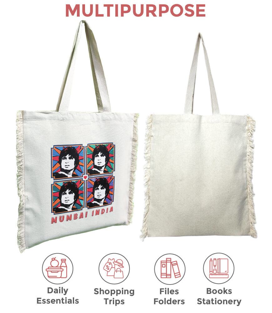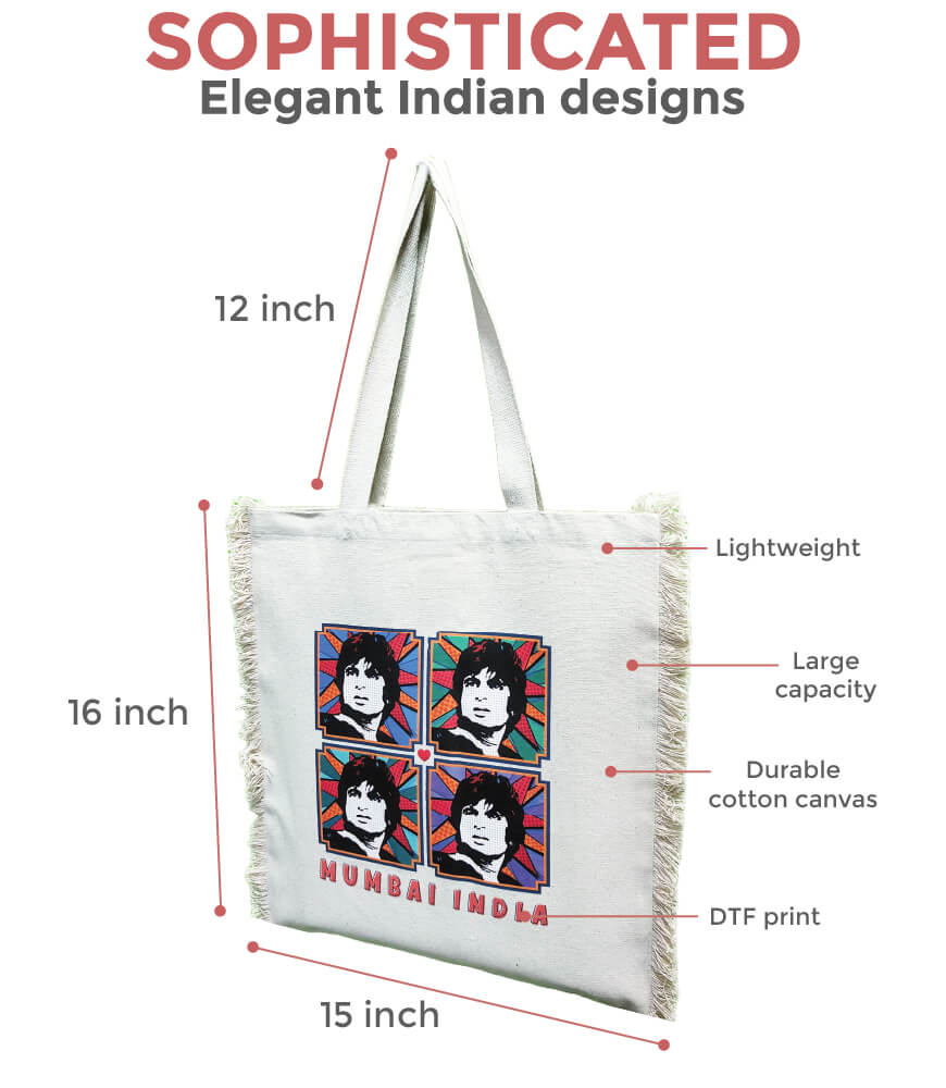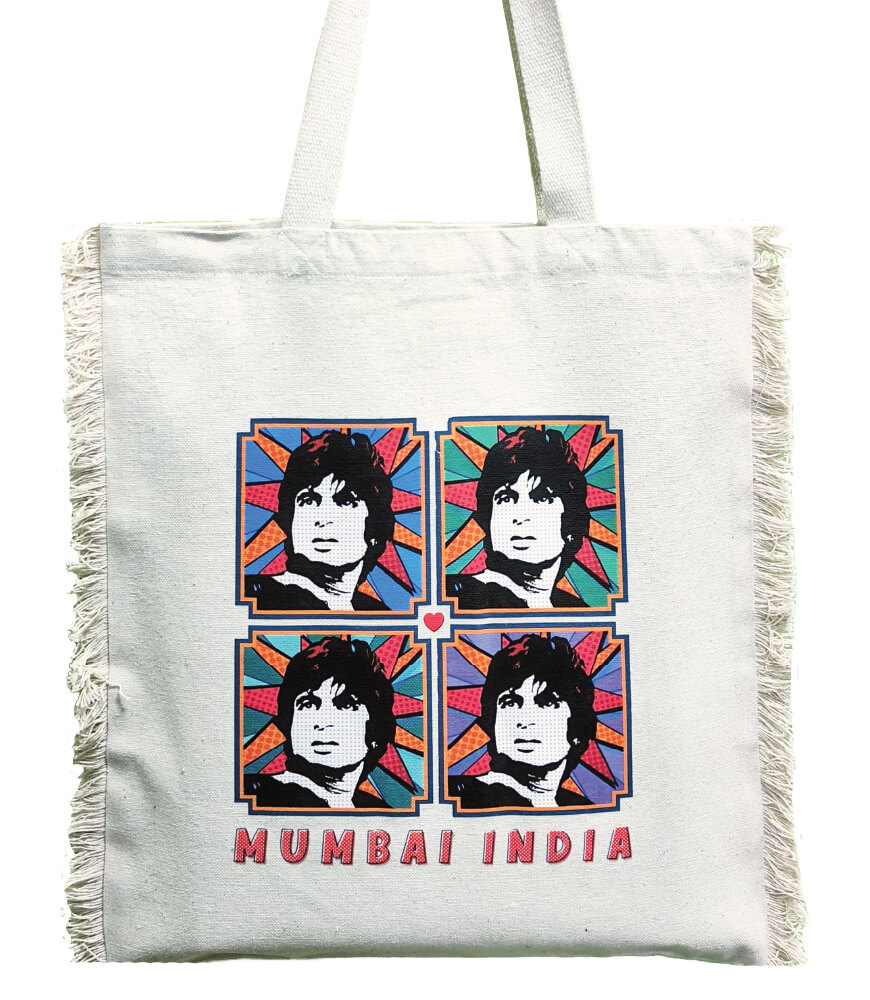 This pop art India canvas tote bag is made with premium cotton. This sturdy cotton eco friendly shopping bag is made to last for years. The cotton canvas tote bag from Maatir lets you achieve your sustainability goals in style. Inspired by the mega star Amitabh Bachchan, this original art print feature on this natural eco friendly shopping bag. Bollywood fans would love this pop art cotton tote bag. Suitable for women, men and children, this tote bag from India is a great gift for the movie buff in your life.