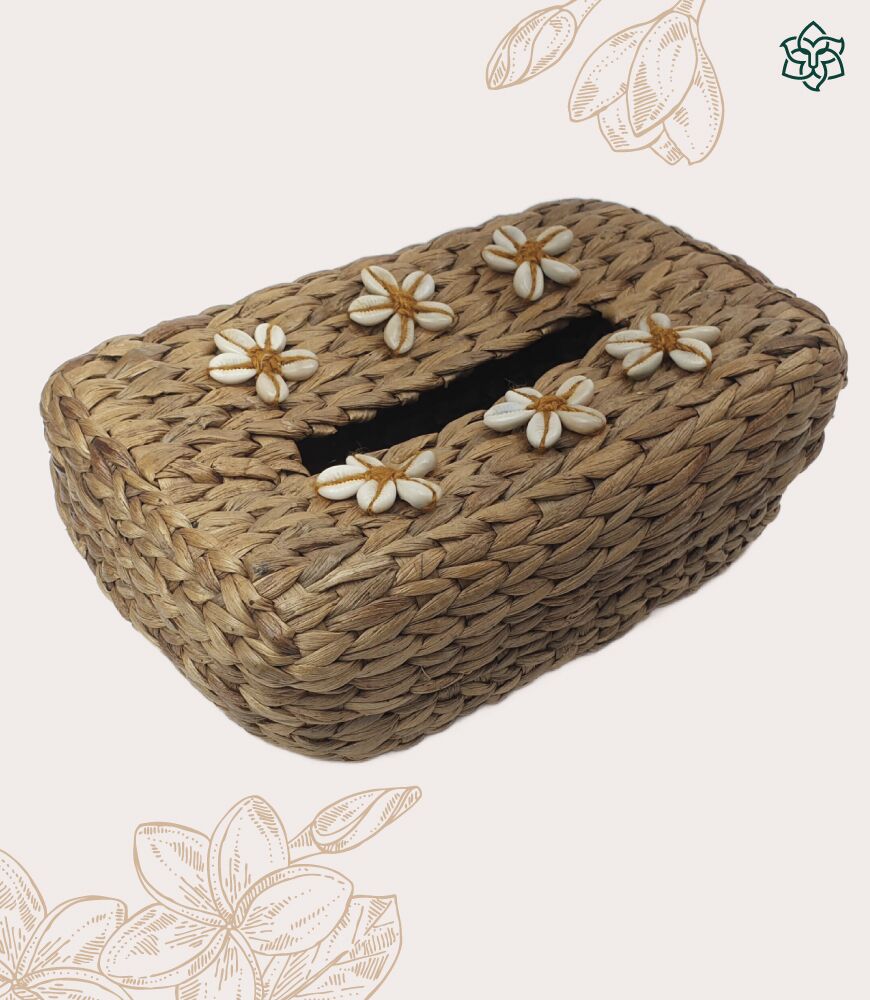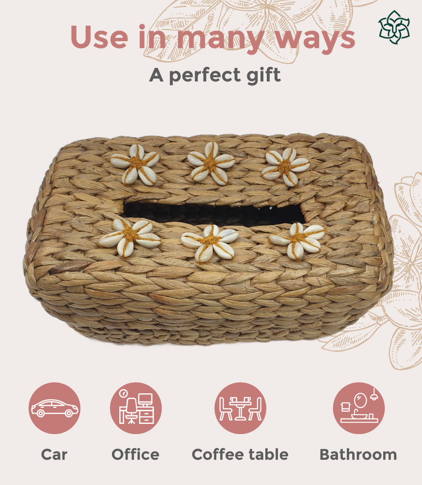 This beautiful 100% organic and natural sabai grass tissue box cover is embellished with cowrie shells. This water hyacinth napkin tissue box holder is perfect for your car as well for your home. The elegant handmade natural tissue box cover is perfect for adding the charm of India to your home décor. Put any size paper napkins in this napkin holder box to bring this beauty to your home or car. This premium tissue paper box makes for a great souvenir gift from India. The rectangular tissue paper dispenser is sturdy and long lasting and will bring a rustic charm and elegance to your space for years to come.