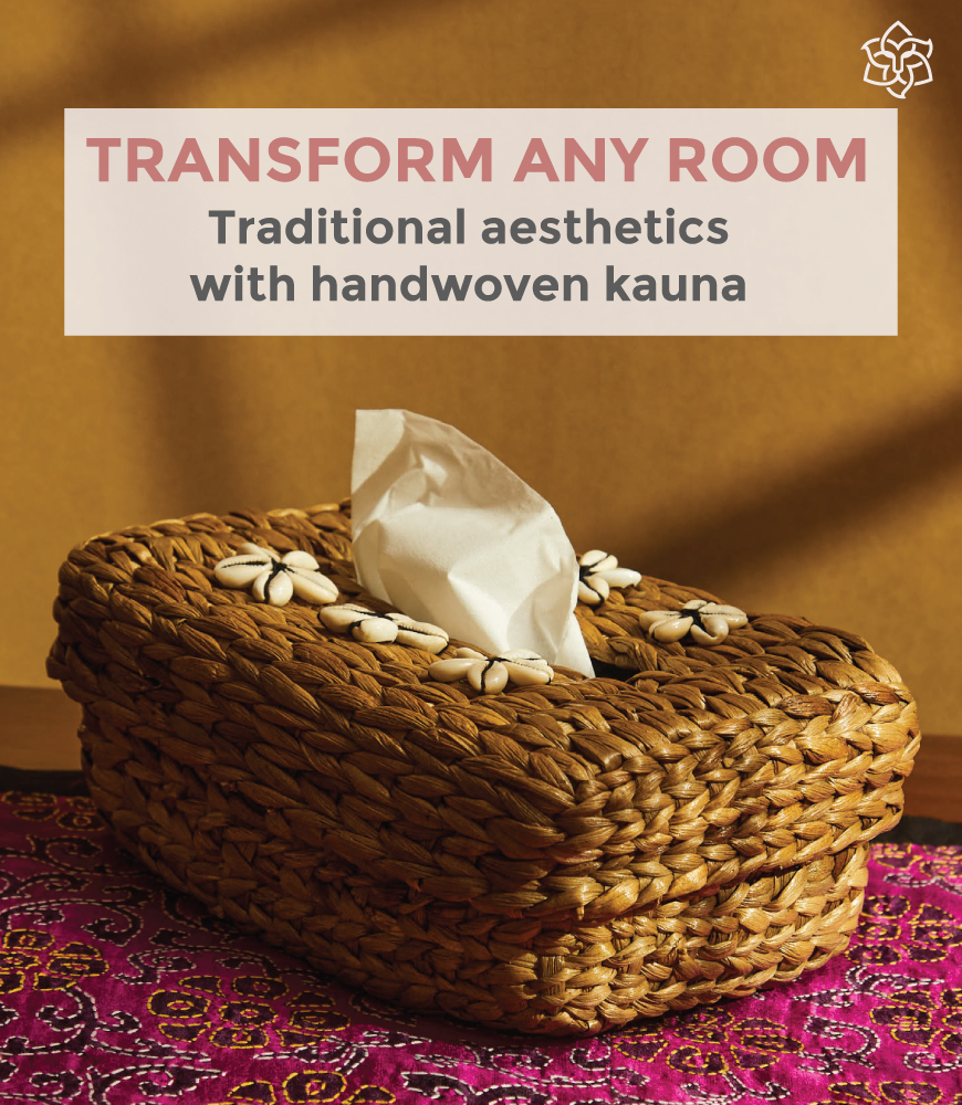 Rural women artisans for Eastern India cut and collect Sabai grass from swamps, dry them in the sun for a few days, then sort the better quality grasses to weave them into this box. Cowrie shells harvested from the Indian Ocean add a rustic charm to the woven grass tissue box.