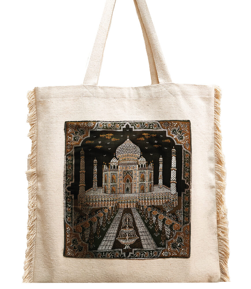 Elevate your accessory game with this exquisite brocade tote bag featuring a regal depiction of the Taj Mahal. The intricate woven design showcases the iconic monument in stunning detail, framed by an ornate border of golden and earthy tones. The rich texture and elegant craftsmanship evoke the timeless grandeur of Mughal art, making this tote a sophisticated statement piece.