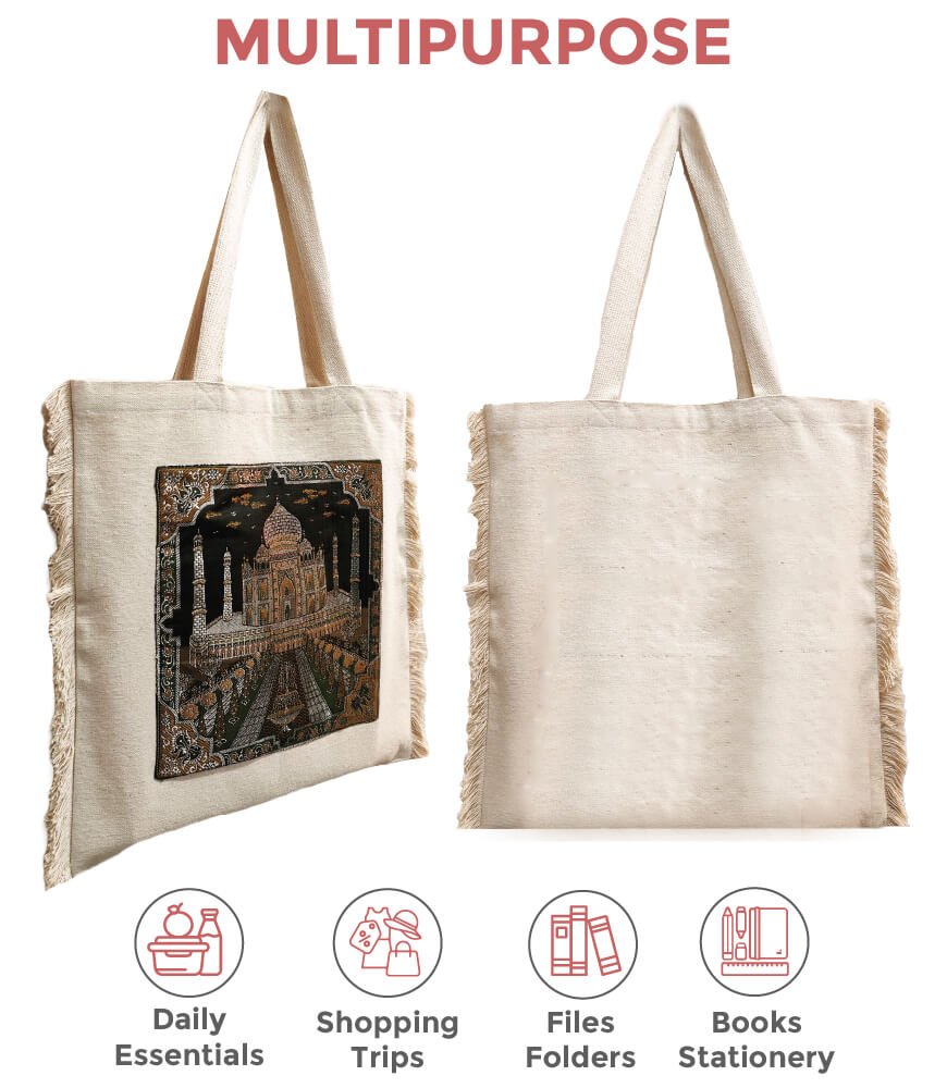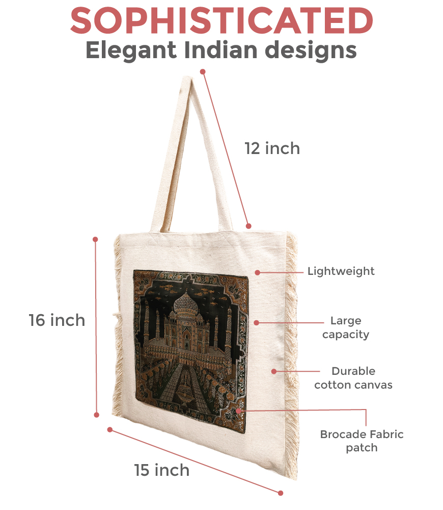 - Material: Crafted from premium-quality fabric with a brocade panel, complemented by sturdy handles and fringed edges for a touch of artisanal charm.