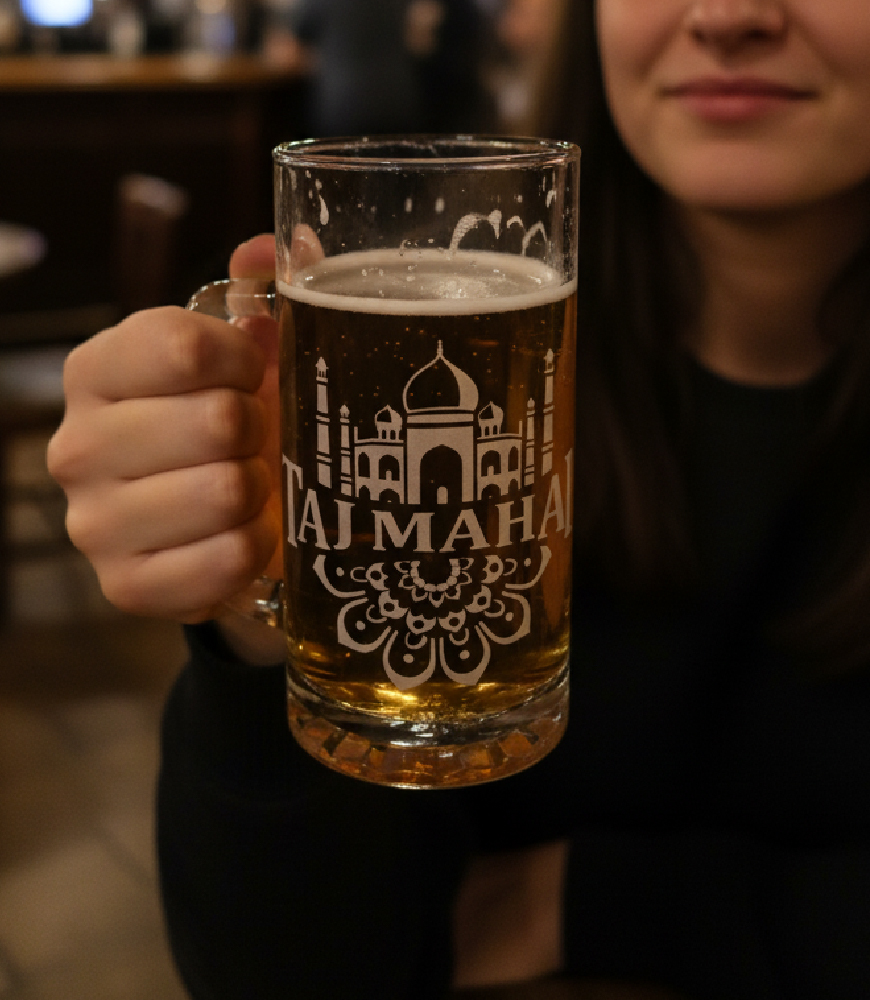 Celebrate the magnificence of one of the world’s most iconic landmarks with this beautifully designed transparent glass beer mug. Featuring a sleek depiction of the Taj Mahal in shimmering metallic white, this mug blends elegance and functionality to elevate your beverage experience.