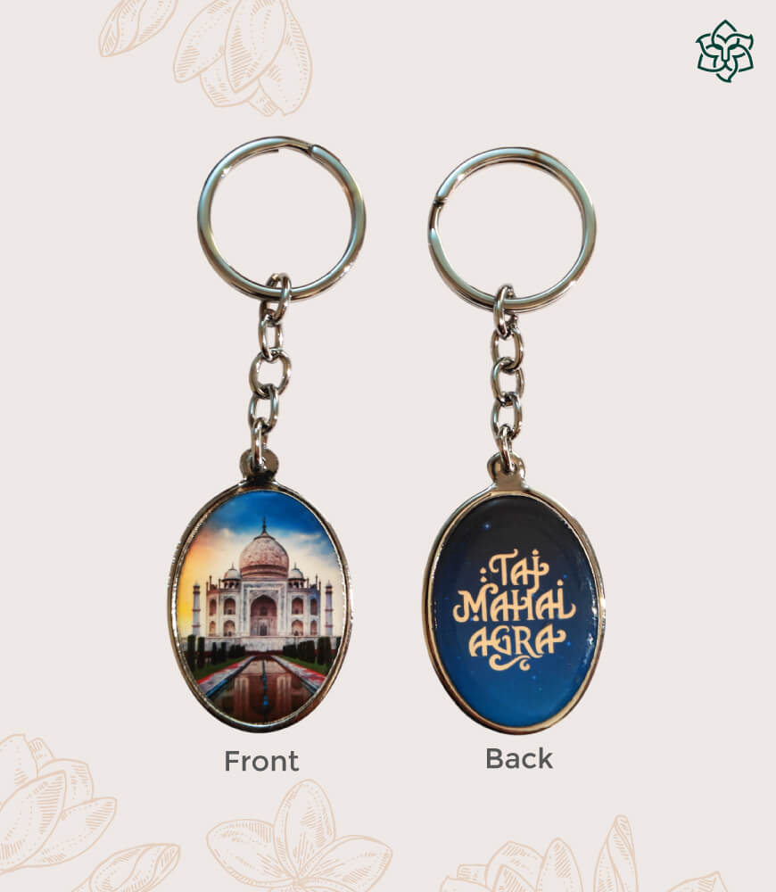 Celebrate the timeless elegance of the Taj Mahal with this beautifully crafted double-sided keychain. Featuring a vibrant, oval-shaped design, one side showcases a stunning depiction of the Taj Mahal at dusk, bathed in warm and serene hues, while the other side displays the words “Taj Mahal Agra” in an artistic golden font against a deep blue background, evoking a sense of royalty and charm.