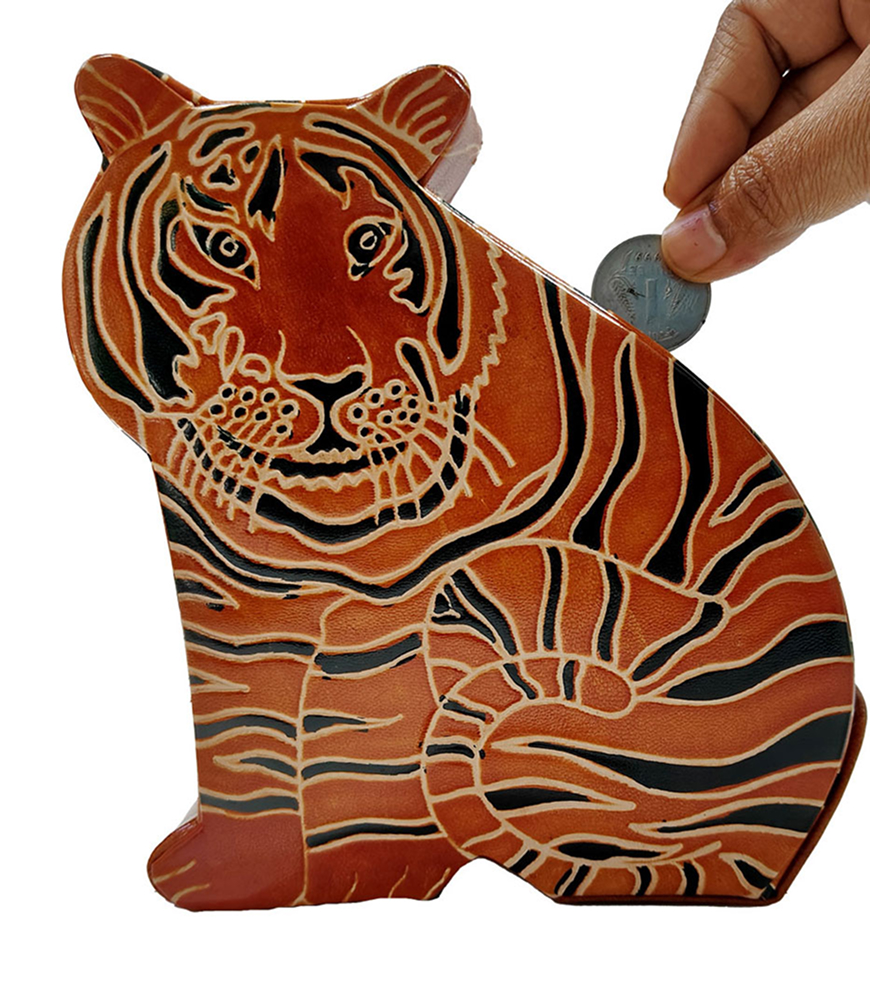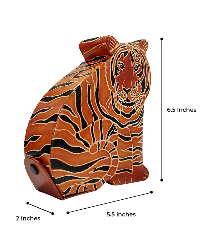 Celebrate the artistry of India’s heritage with this exquisite, handcrafted leather coin box, designed in the shape of a majestic tiger. This unique piece is a proud example of a GI (Geographical Indication) tagged craft, preserving the legacy of traditional craftsmanship. Its vibrant orange, black, and white hues are skillfully hand-painted to showcase the tiger’s intricate details, making it as much a decorative item as it is functional.