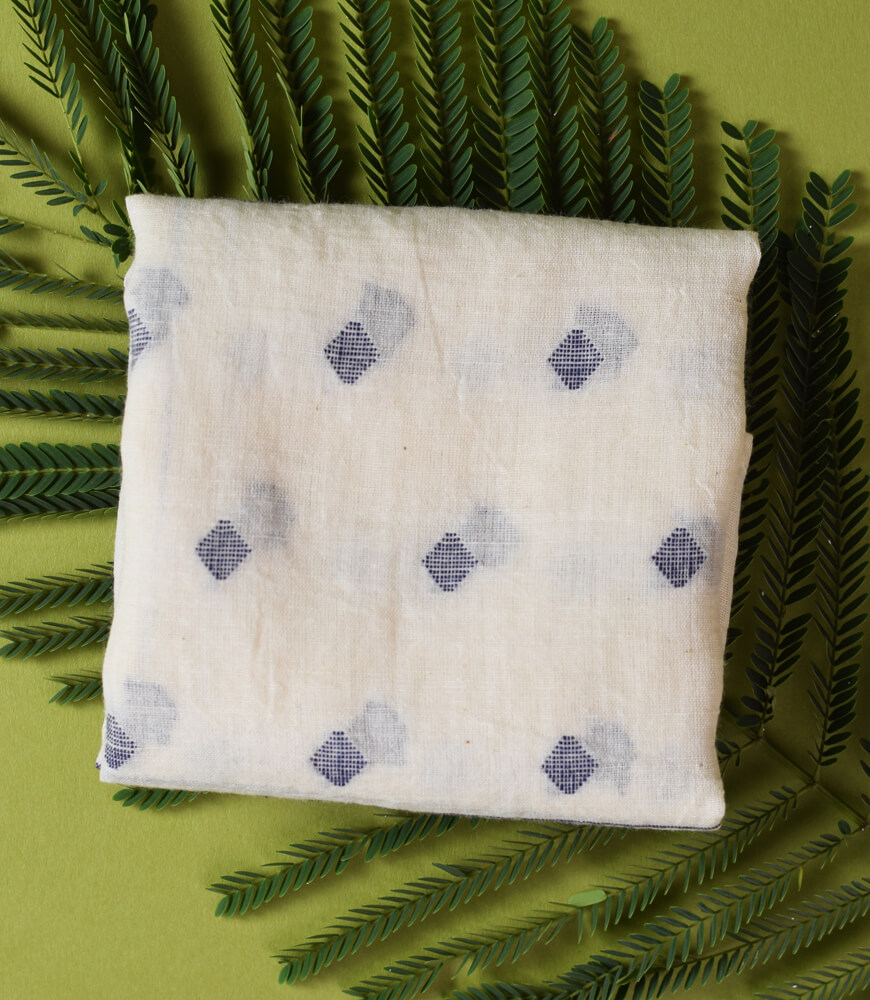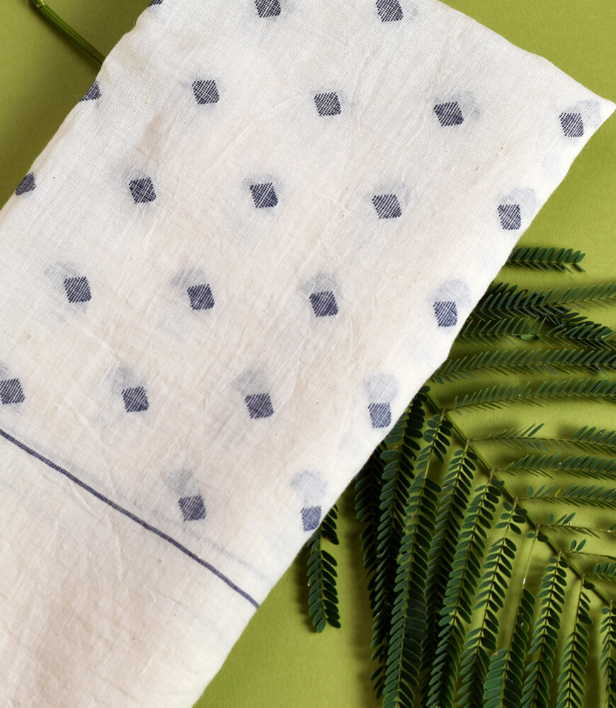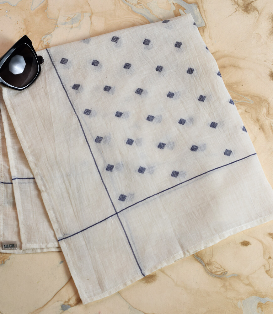 This chic classic white and navy Khadi Jamdani bandana or neckerchief with 116 hand woven square polka dots is soft and featherweight. Instantly adding elegance to any outfit, this airy skin friendly bandana or neckerchief is made of hand-spun khadi yarn that is made on a charkha. The Jamdani is considered the queen of weaves, and this scarf is made by master weavers with the softest hand spun cotton available. What’s even more special is that it gets softer with every wash, lasts a lifetime, and is 100% biodegradable.