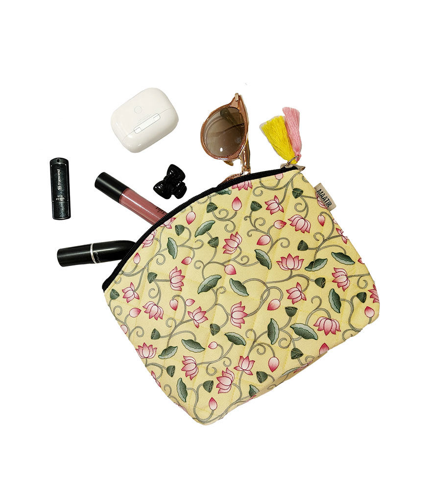 This pretty Pichwai floral lotus print has been created to bring color and charm to your travel toiletry and make-up routine. The smaller pouch is perfectly sized for your sunglasses and easily holds up to two pairs. This multipurpose waterproof pouch set is lightweight, hardy, waterproof and comes in 2 useful sizes to make travel organization easy.